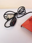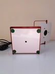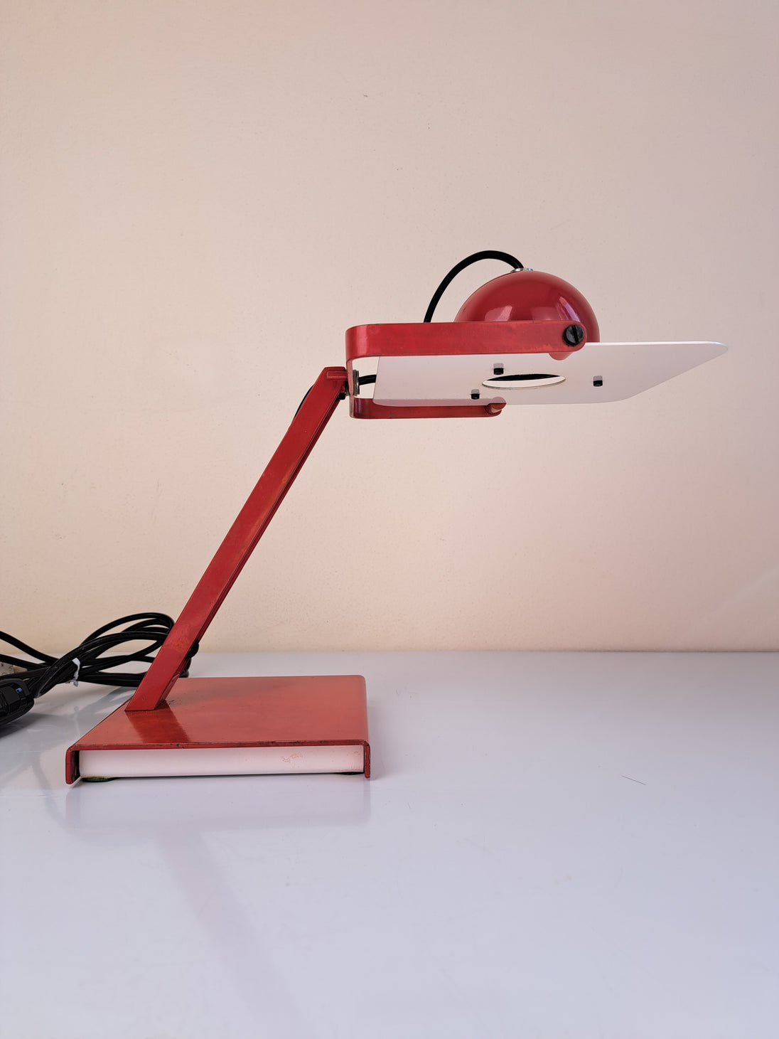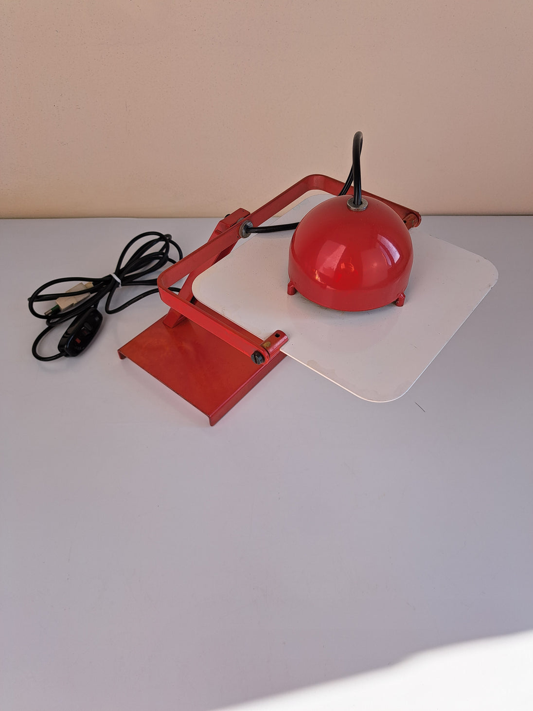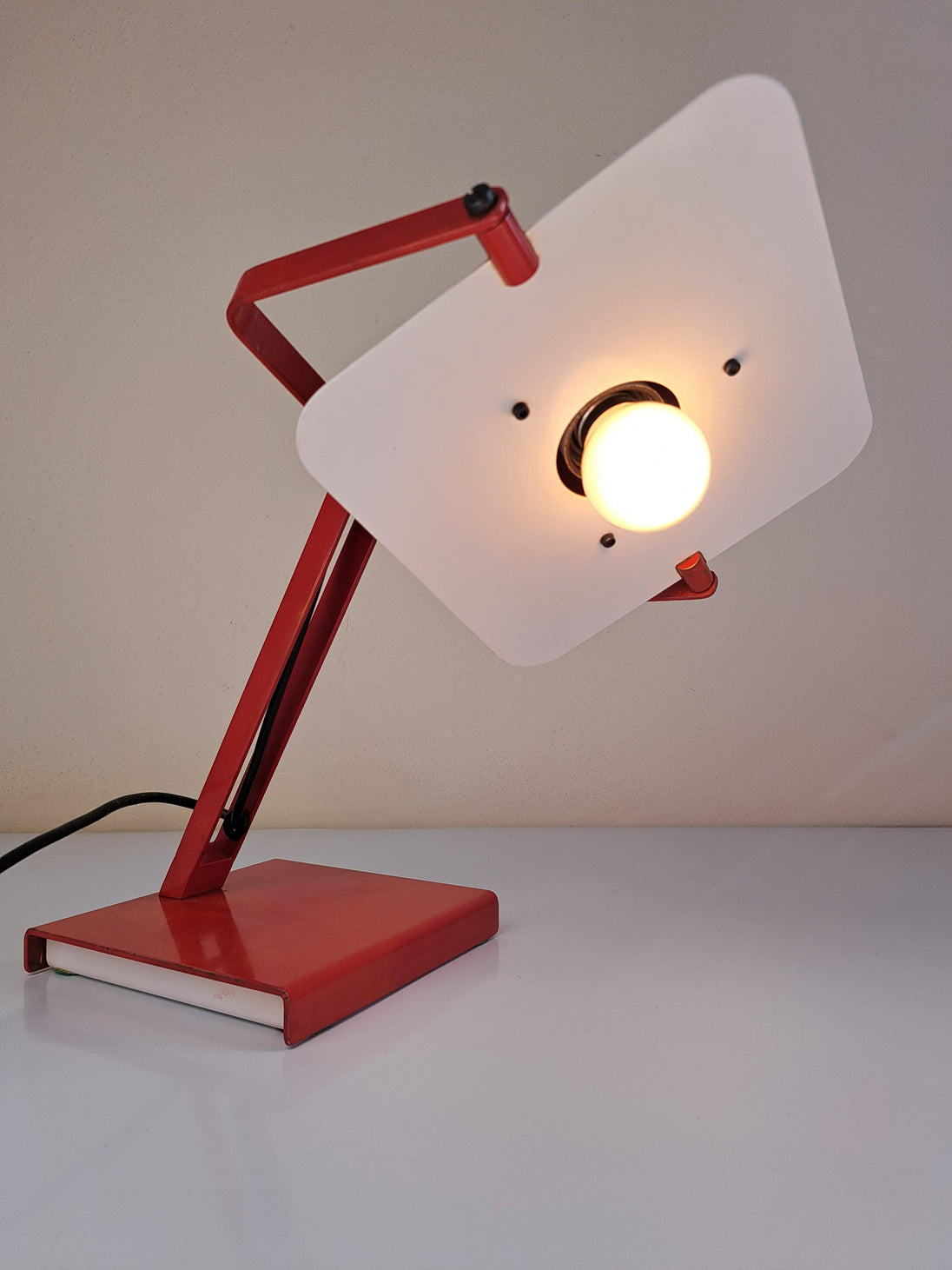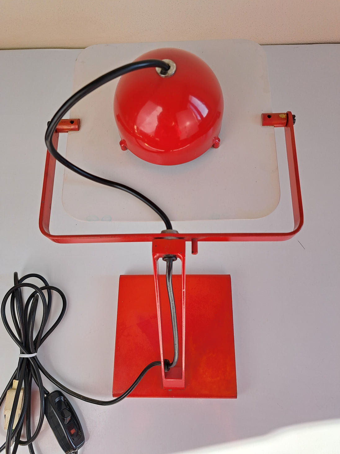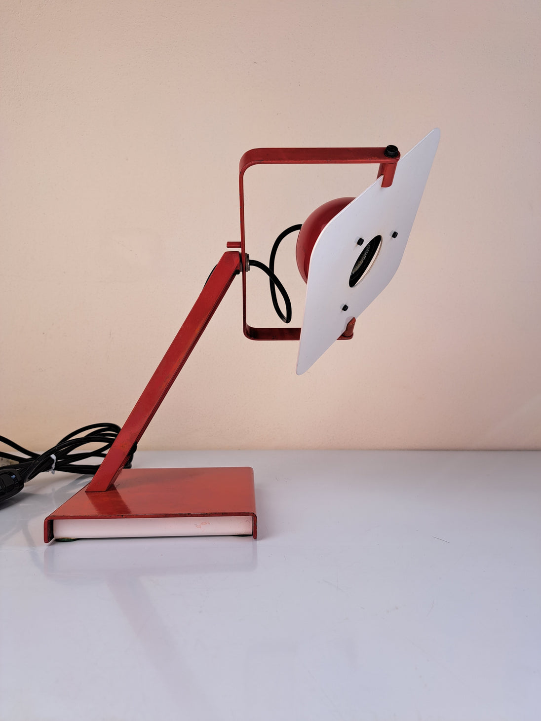Lampada da scrivania anni 70/80 in metallo verniciato rosso e bianco con luce orientabile. Design ricercato con luce orientabile in due snodi: il braccetto rosso con sezione a U consente di inclinarla lateralmente mentre la placca bianca a cui è fissato il punto luce si inclina frontalmente. Buone condizioni generali con segni di utilizzo e del tempo, si evidenziano degli aloni leggermente scoloriti sulla base rossa. Attacco portalampada E27.
