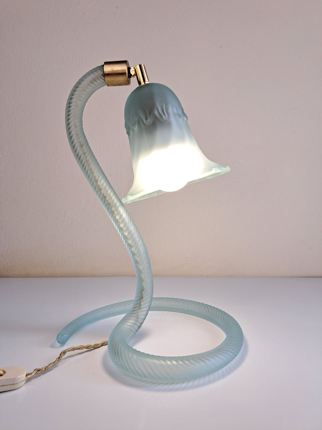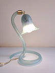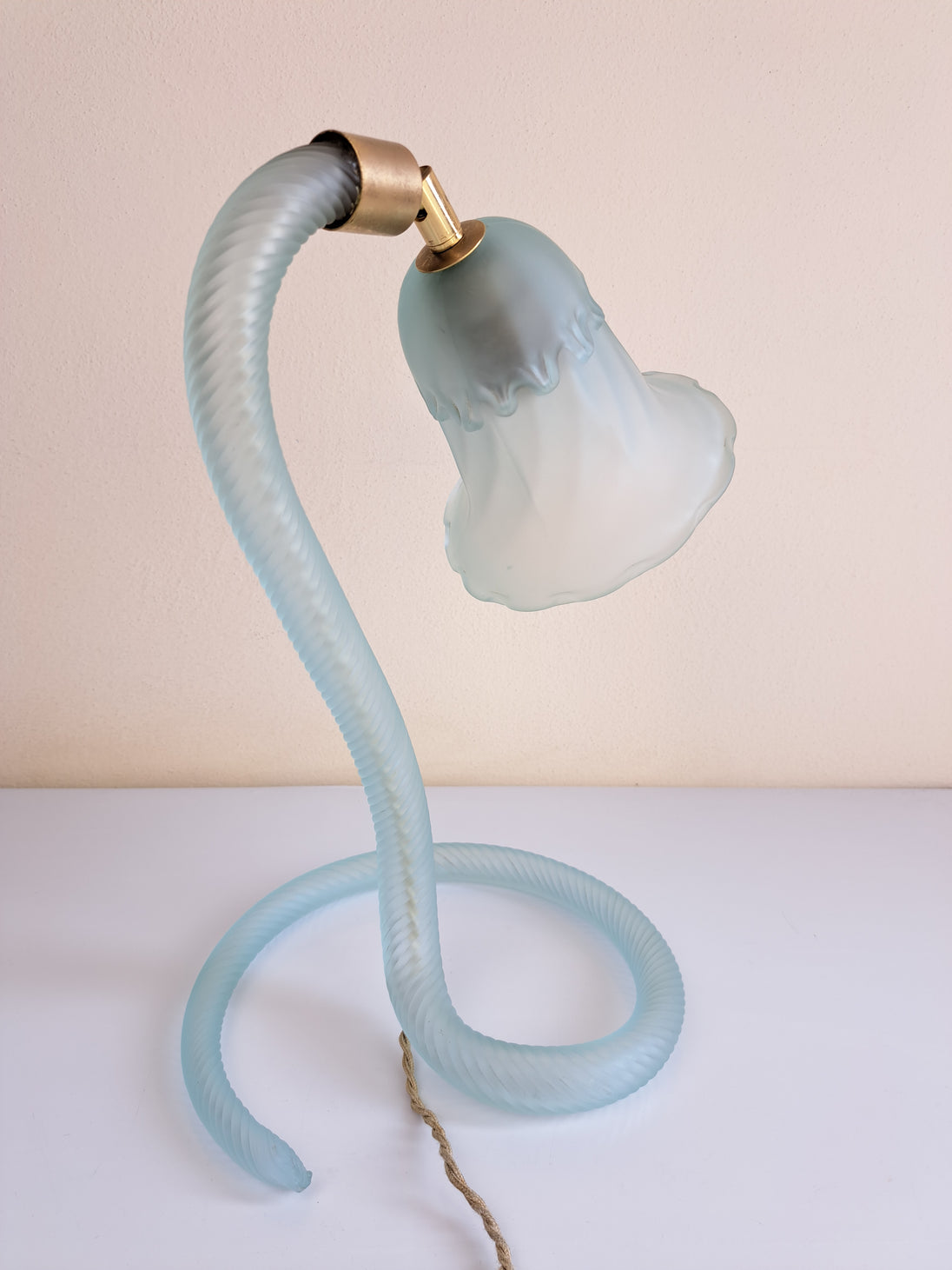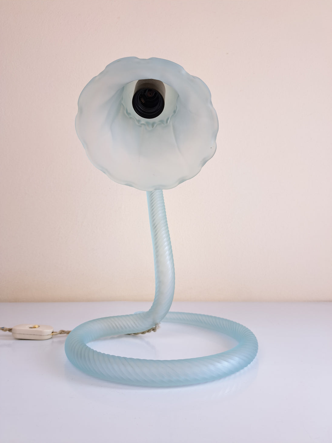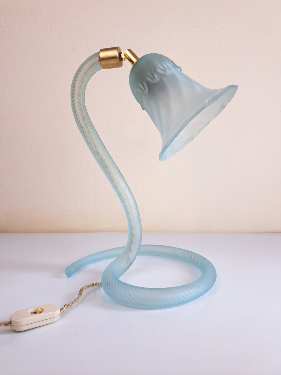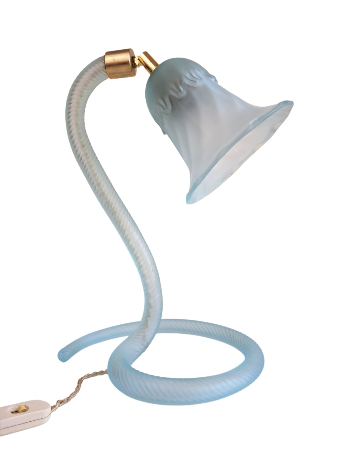 Lampada in vetro satinato azzurro con inserti in metallo dorato, attribuibile alla produzione del vetro artistico di Murano anni 70. Composizione di gusto classico con uno stelo ricurvo in tubolare di vetro arricciato come un serpente o una corda e paralume a campana floreale, tra lo stelo e il paralume uno snodo in metallo che consente di orientare la lampada a piacere. Ottime condizioni generali con piccoli graffi superficiali sul paralume. Attacco portalampada E27.