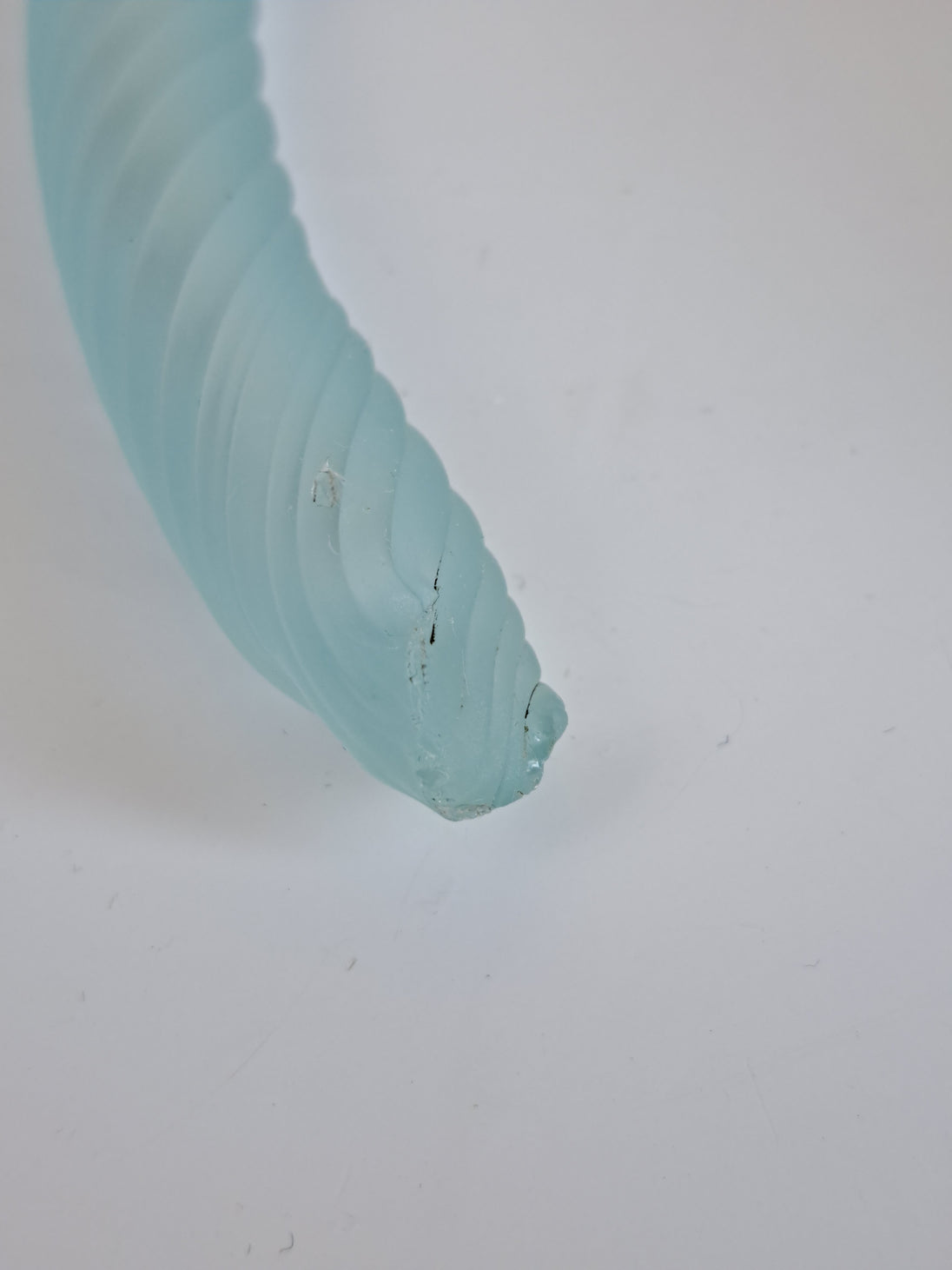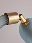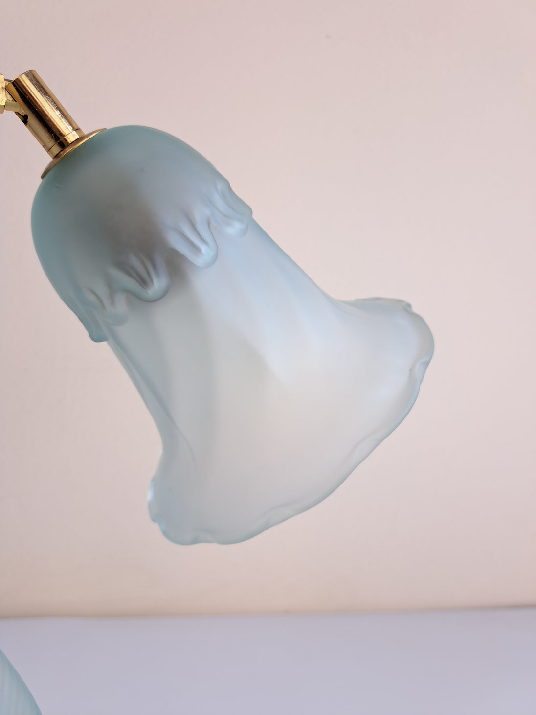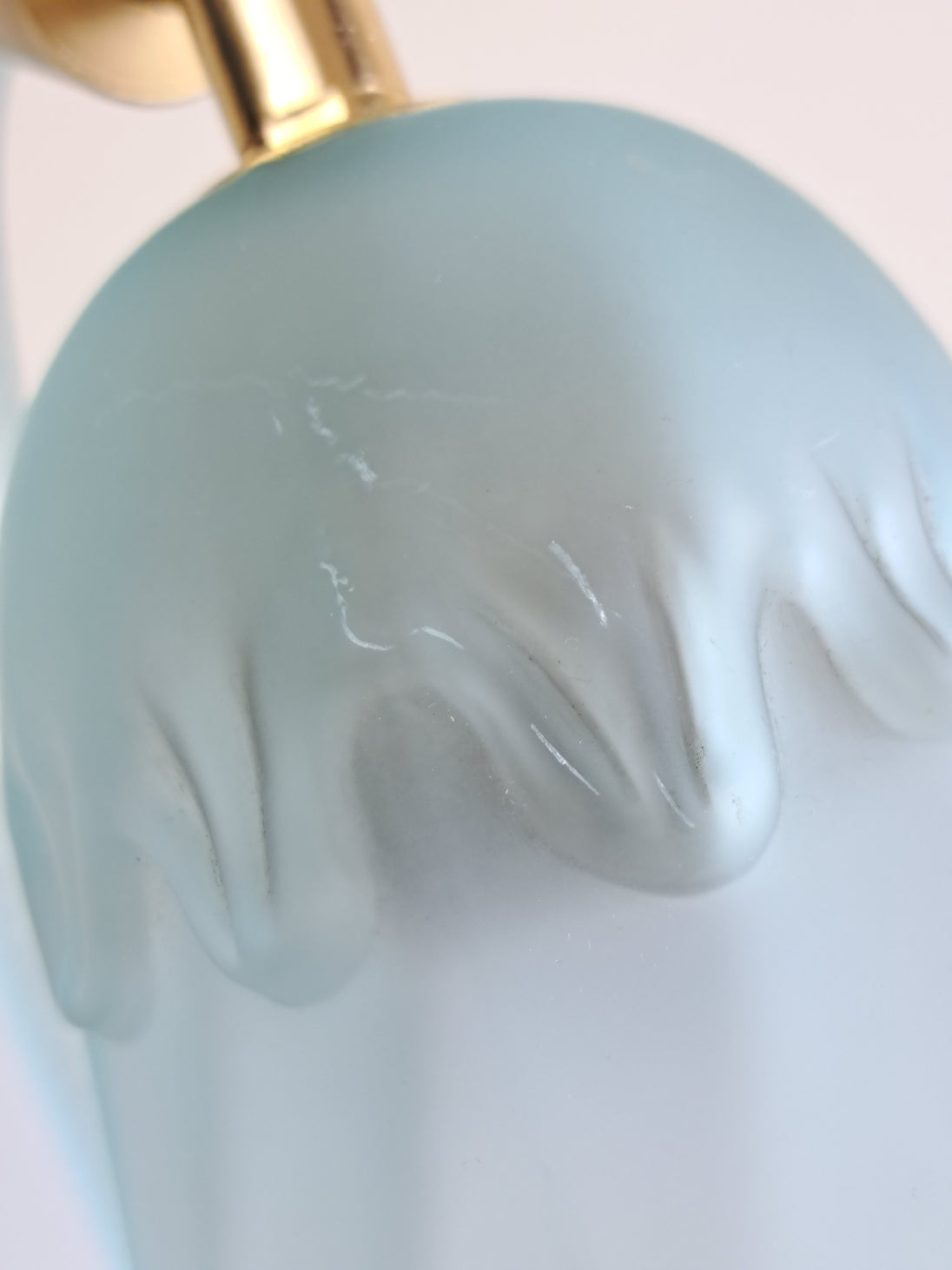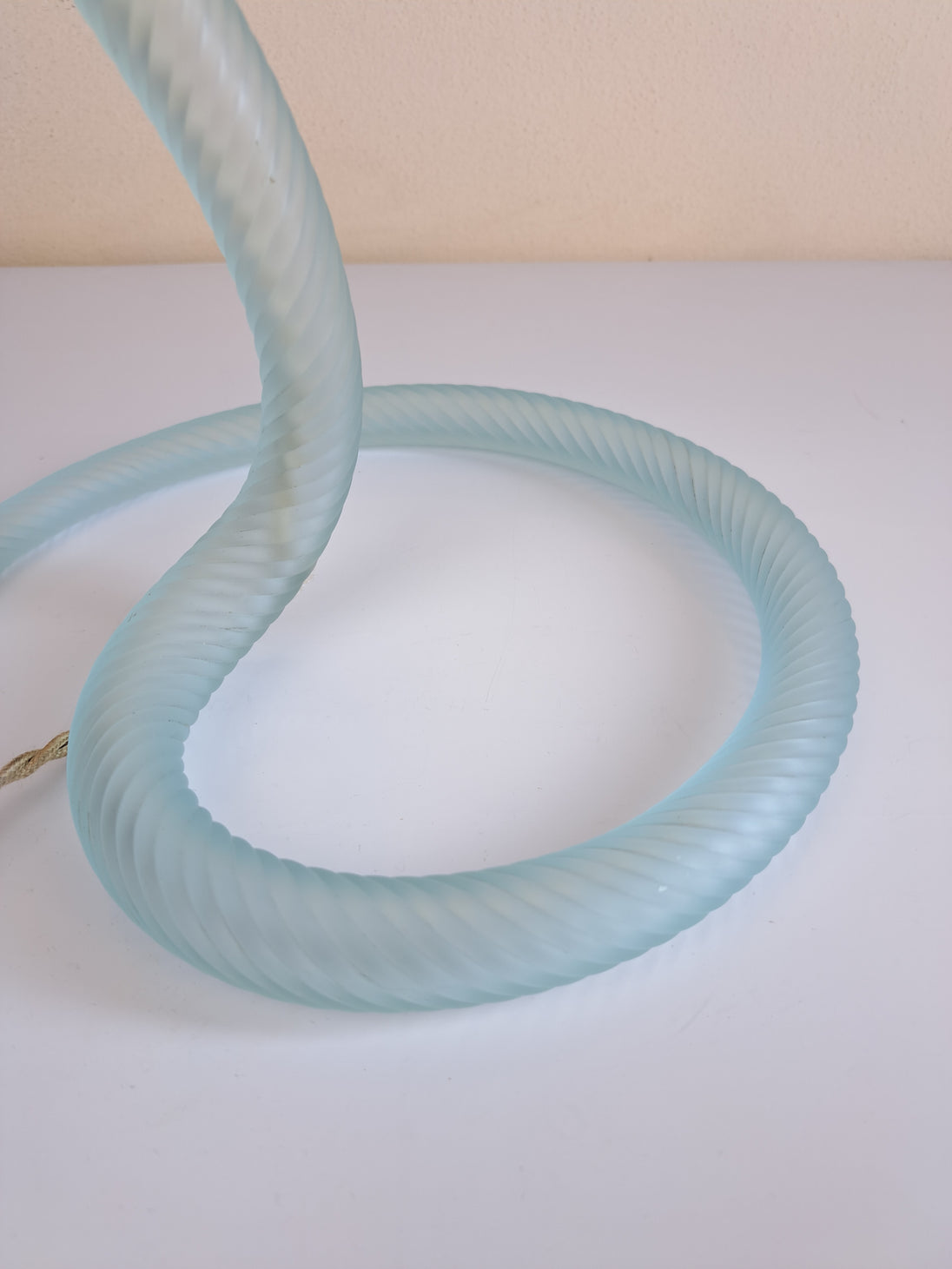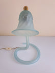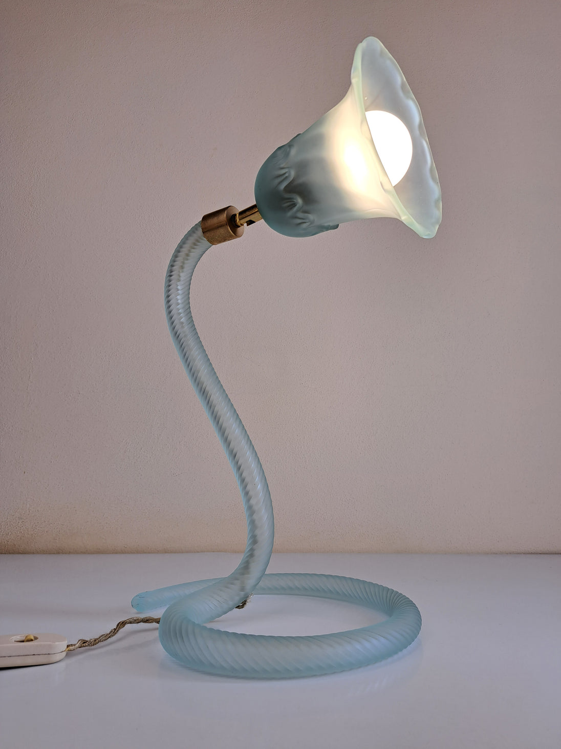 Lampada in vetro satinato azzurro con inserti in metallo dorato, attribuibile alla produzione del vetro artistico di Murano anni 70. Composizione di gusto classico con uno stelo ricurvo in tubolare di vetro arricciato come un serpente o una corda e paralume a campana floreale, tra lo stelo e il paralume uno snodo in metallo che consente di orientare la lampada a piacere. Ottime condizioni generali con piccoli graffi superficiali sul paralume. Attacco portalampada E27.
