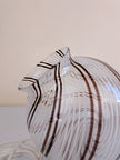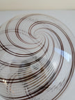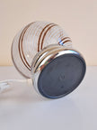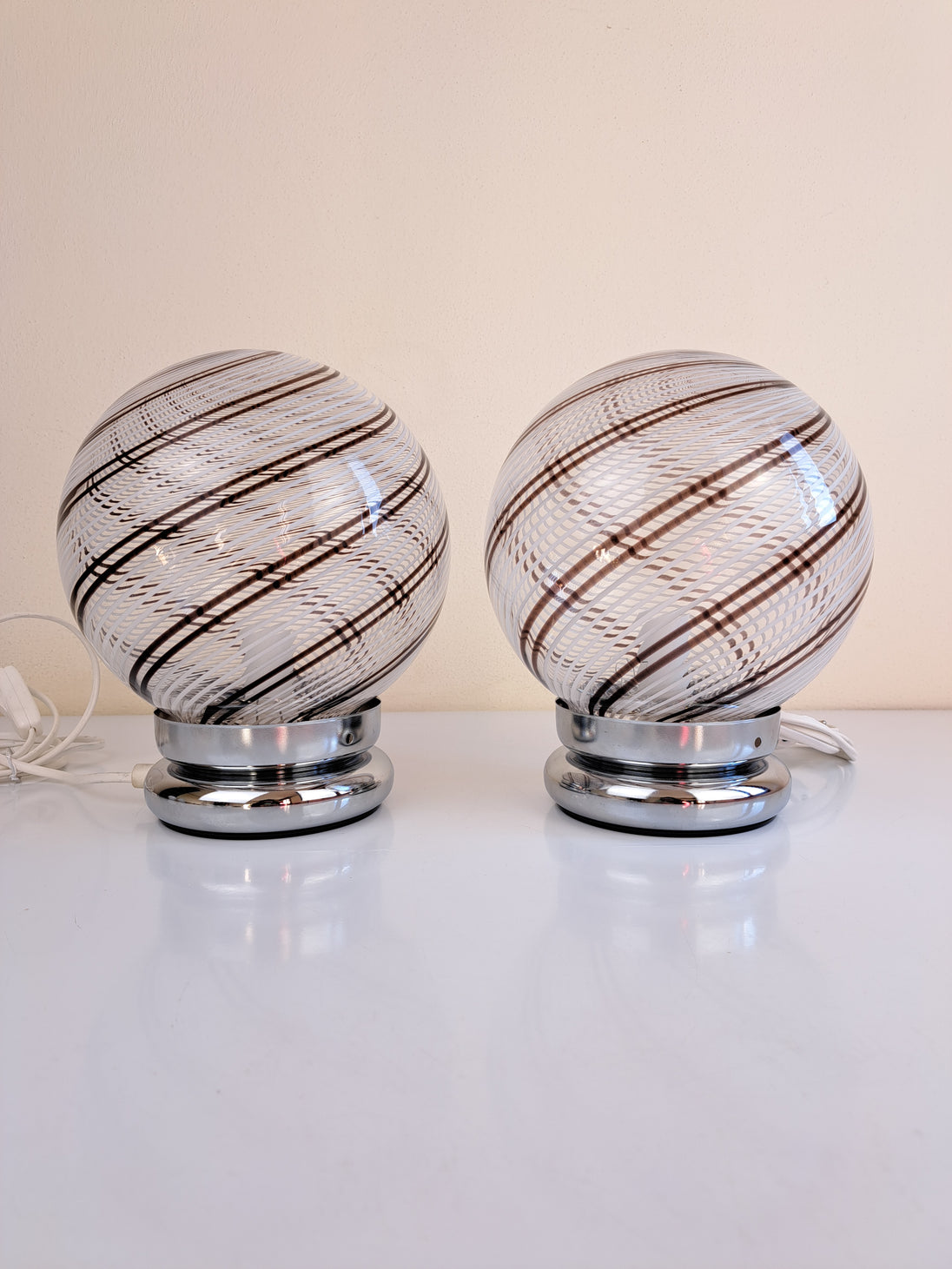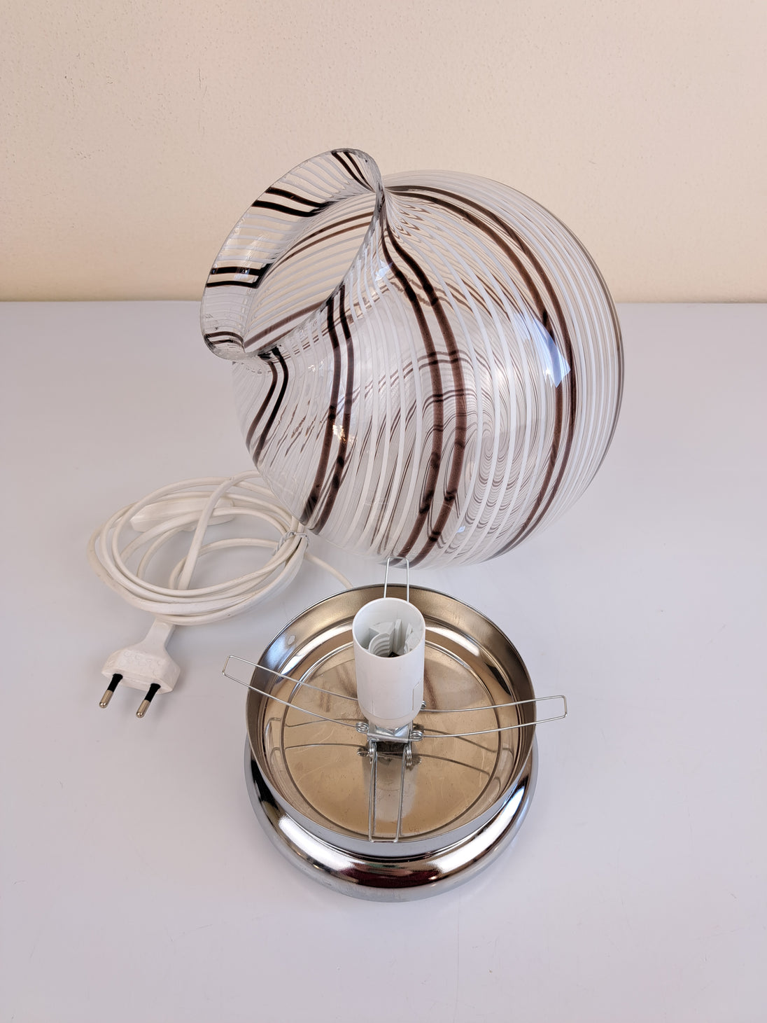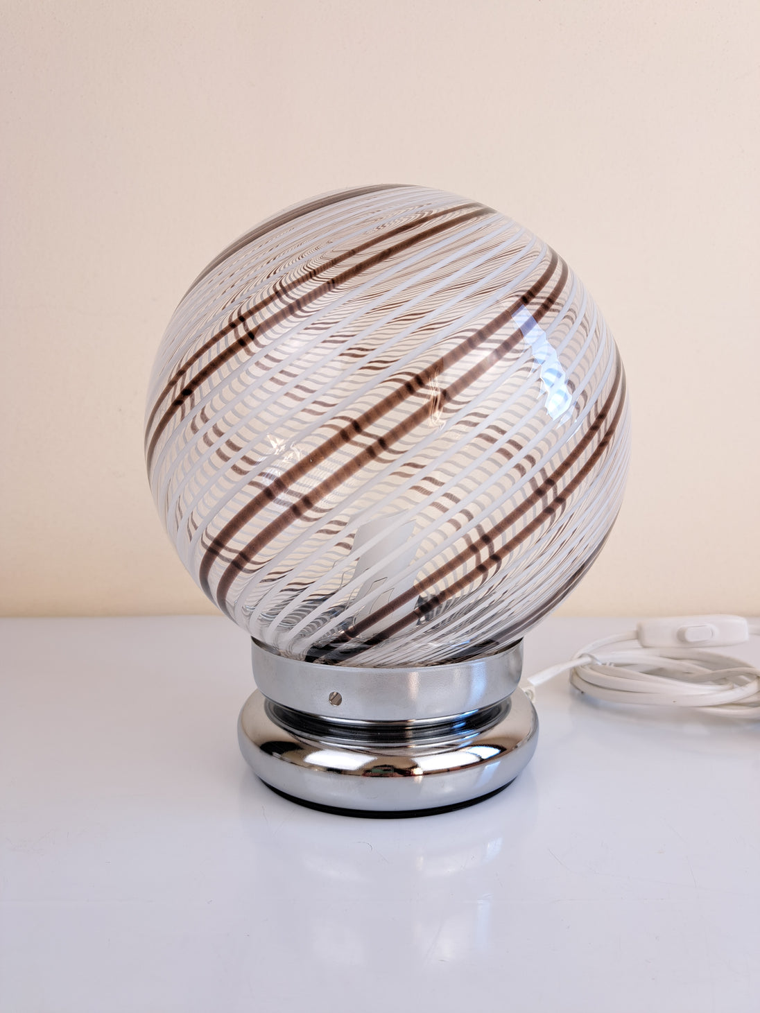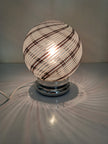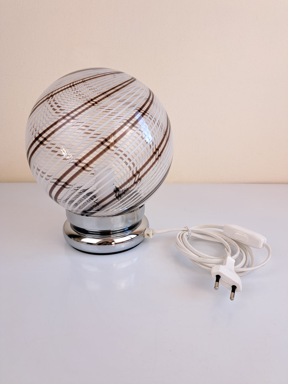 Lampada a sfera anni 70 attribuibile alla produzione del vetro di Murano, come nuova da fondi di magazzino. Lampada da tavolo o comodino con base in metallo cromato e paralume sferico in vetro lavorato a mano, decoro in filigrana a spirale con righe bianche e marroni, attacco portalampada E14, impianto elettrico a nuovo. Questa lampada si adatta ad ogni tipo di ambiente, in ingresso, su una libreria o sul comodino. Un esempio delle maestrie muranesi e del design italiano per dare un tocco vintage ed elegante alla vostra casa. Disponibili 4 quantità.