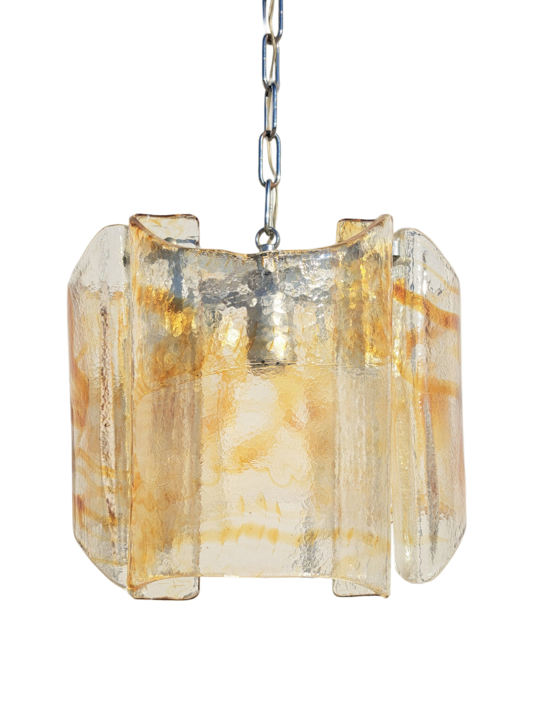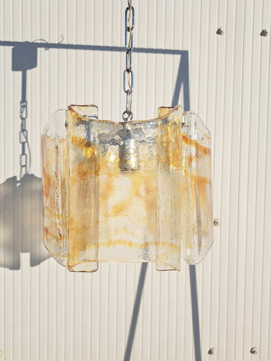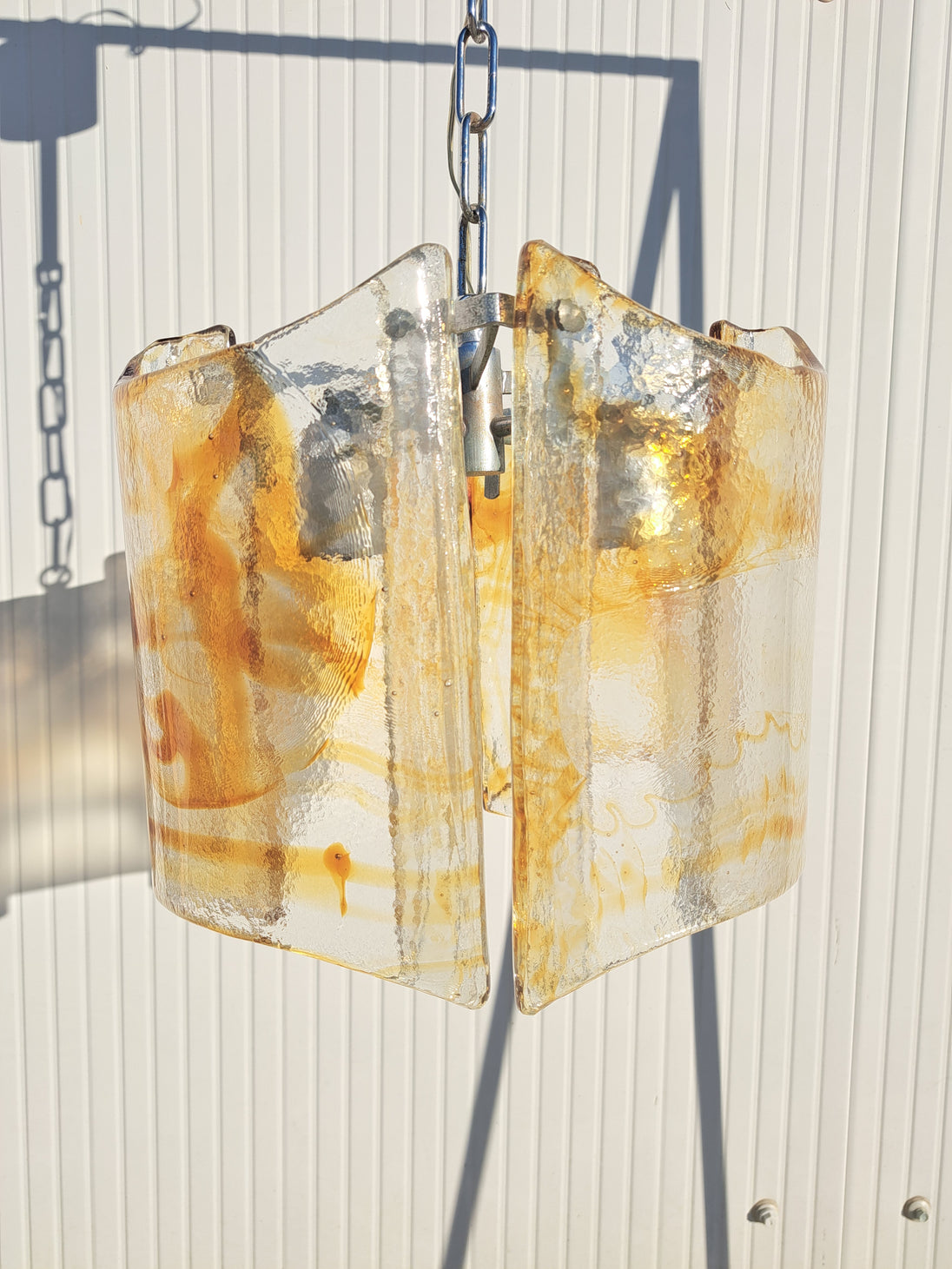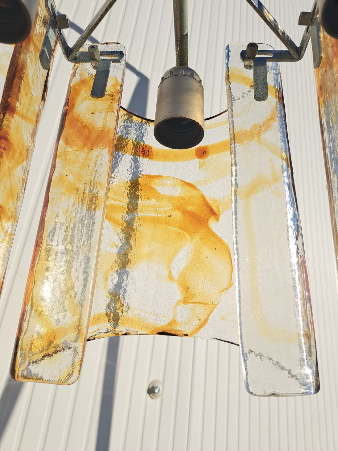 Lampadario anni 70 in vetro di Murano con struttura in metallo cromato, realizzato nello stile delle creazioni Mazzega. Questa lampada a sospensione è formata da 4 vele ricurve in vetro trasparente texturizzato e con disegni ambrati, struttura in metallo cromato e 4 punti luce con portalampada E27. Piccole bolle e l'irregolarità del vetro dimostrano la lavorazione eseguita a mano. Buone condizioni generali con segni di ossidazione e del tempo sulle parti metalliche.