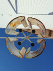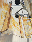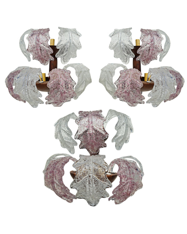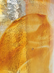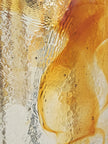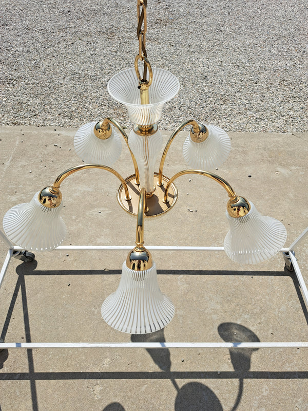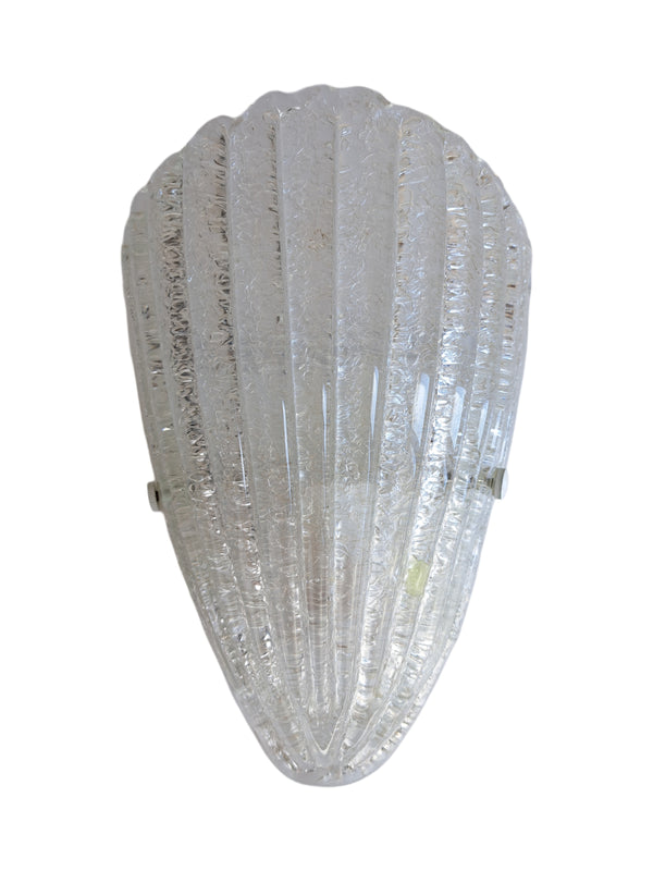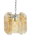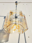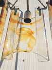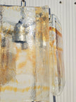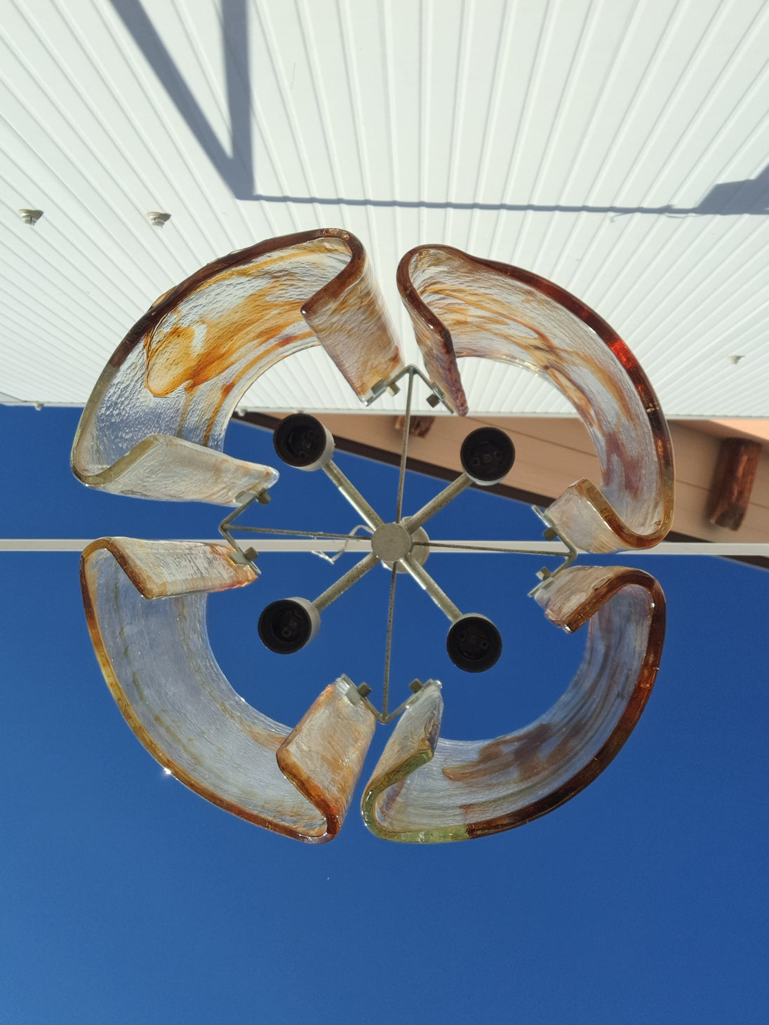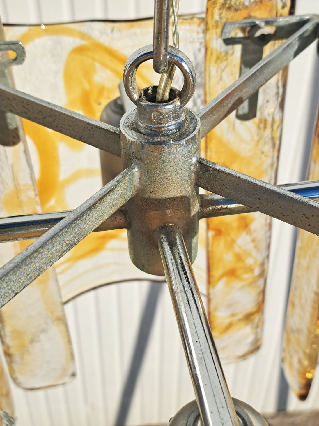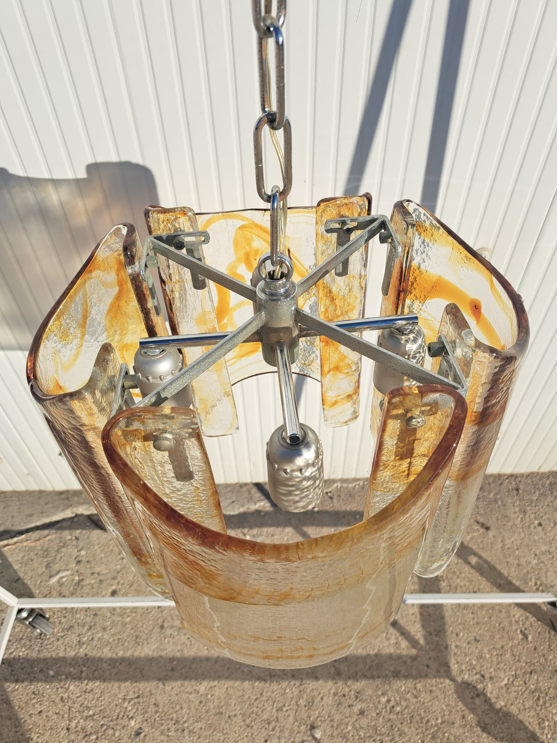 Lampadario anni 70 in vetro di Murano con struttura in metallo cromato, realizzato nello stile delle creazioni Mazzega. Questa lampada a sospensione è formata da 4 vele ricurve in vetro trasparente texturizzato e con disegni ambrati, struttura in metallo cromato e 4 punti luce con portalampada E27. Piccole bolle e l'irregolarità del vetro dimostrano la lavorazione eseguita a mano. Buone condizioni generali con segni di ossidazione e del tempo sulle parti metalliche.