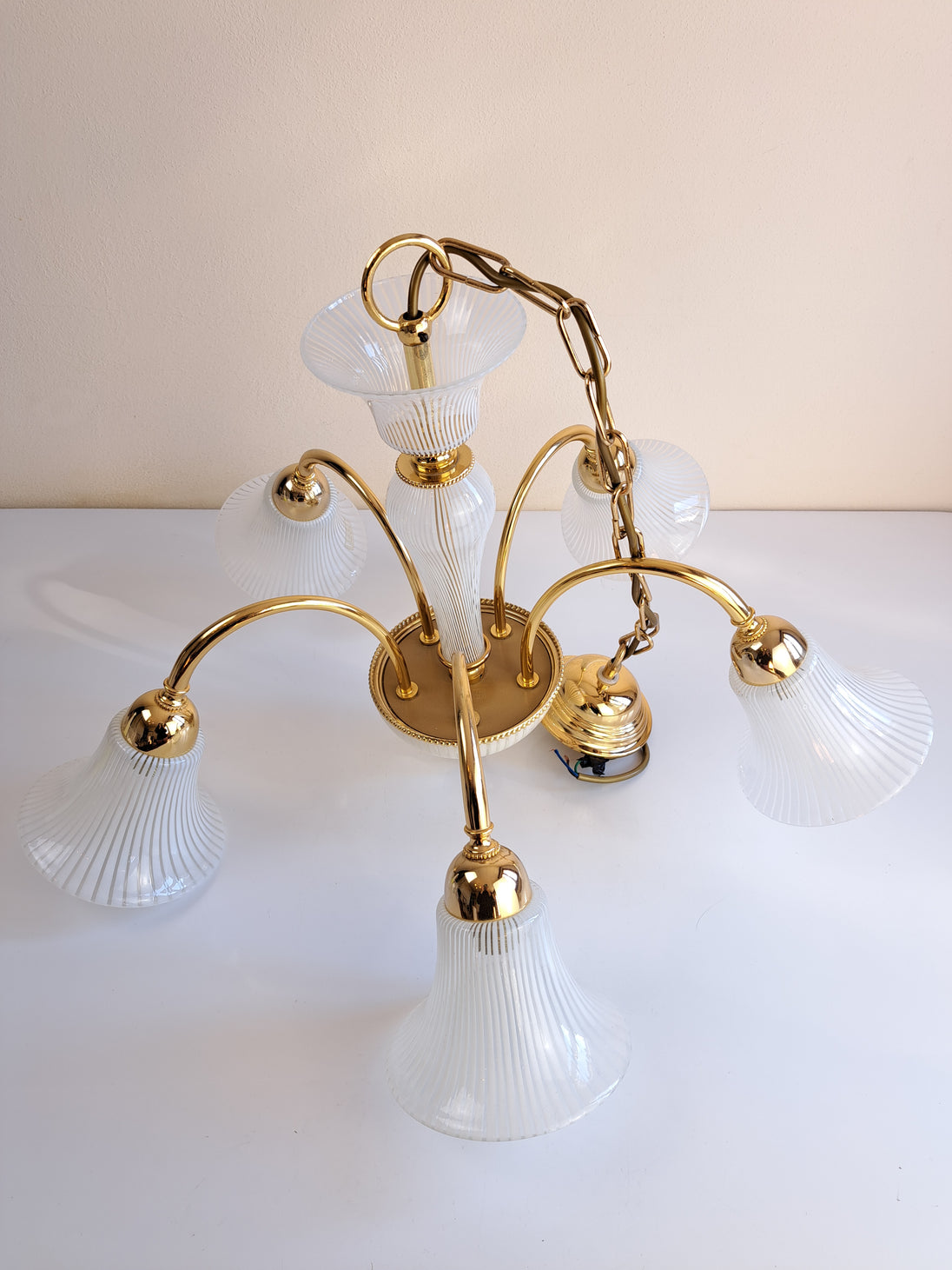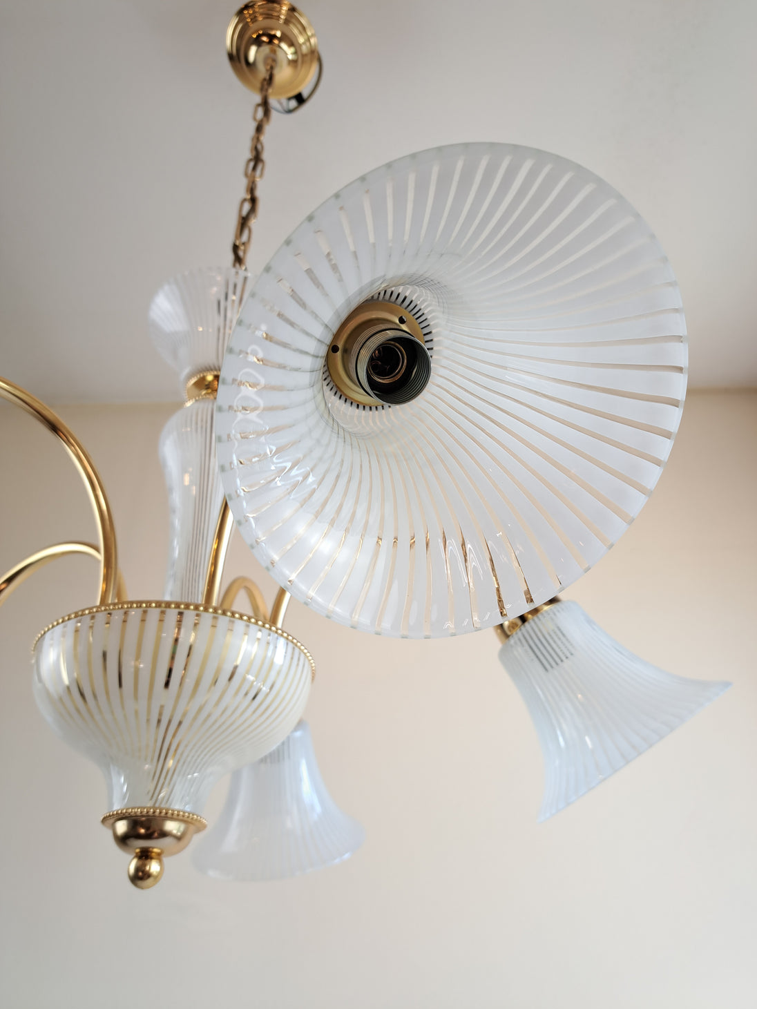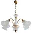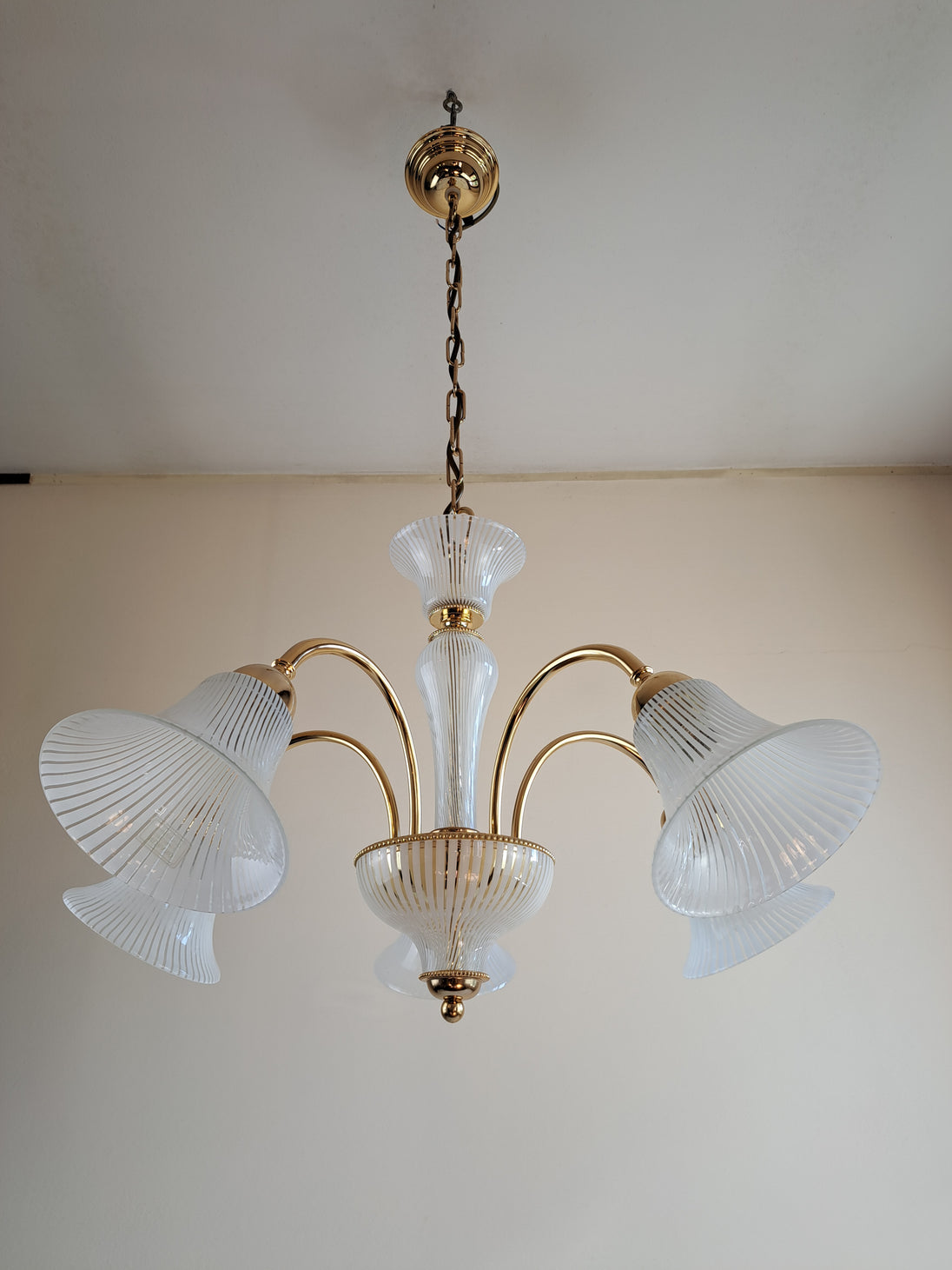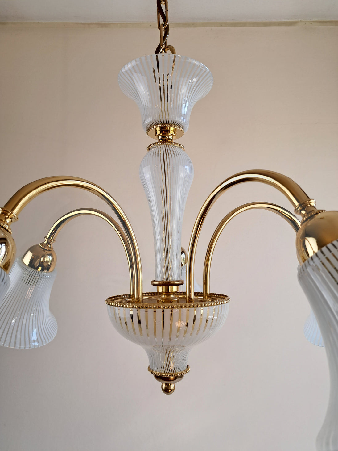 Lampada a sospensione a 5 luci prodotta negli 80/90 da F. Fabbian. Questo lampadario ha una struttura in metallo dorato con inserti e paralumi in vetro prodotti a Murano e caratterizzati da un decoro a canne bianche e trasparenti alternate. L'eleganza classica della forma si bilancia con la geometria e leggerezza del vetro che strizza l'occhio ad un gusto più moderno. Marchio di fabbrica "F. Fabbian Made in Italy" impresso sulla struttura e bollino di garanzia "Murano Originale Garantito" sui vetri. Ottime condizioni generali, attacchi portalampade E14.
