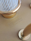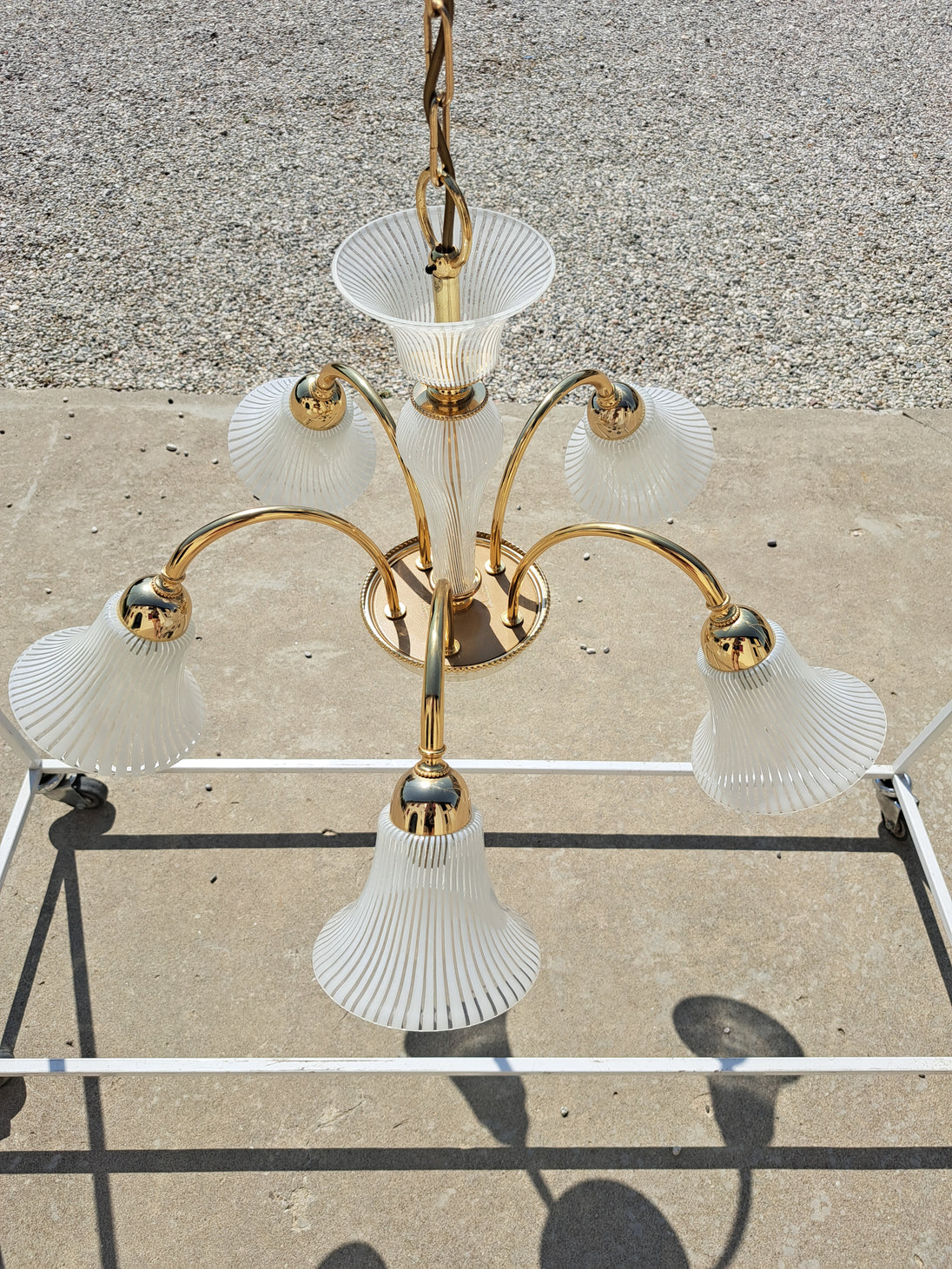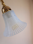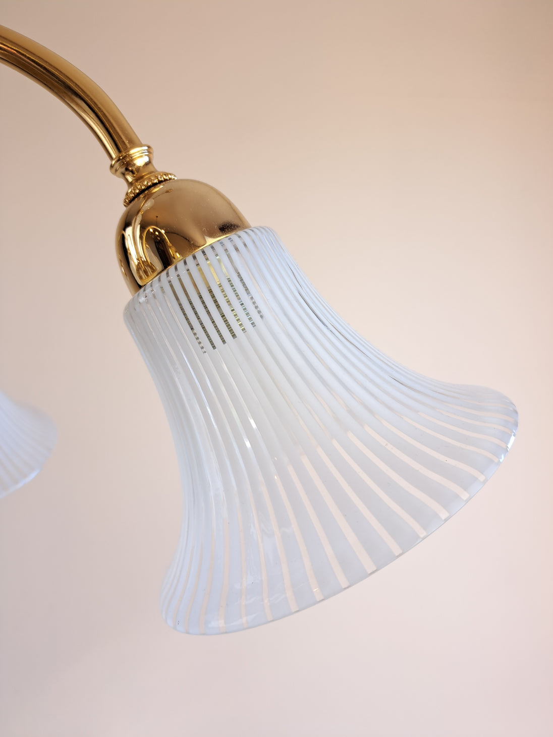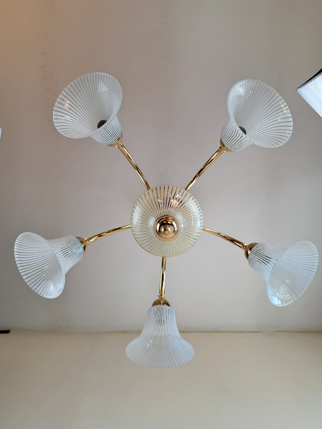 Lampada a sospensione a 5 luci prodotta negli 80/90 da F. Fabbian. Questo lampadario ha una struttura in metallo dorato con inserti e paralumi in vetro prodotti a Murano e caratterizzati da un decoro a canne bianche e trasparenti alternate. L'eleganza classica della forma si bilancia con la geometria e leggerezza del vetro che strizza l'occhio ad un gusto più moderno. Marchio di fabbrica "F. Fabbian Made in Italy" impresso sulla struttura e bollino di garanzia "Murano Originale Garantito" sui vetri. Ottime condizioni generali, attacchi portalampade E14.