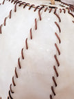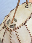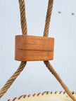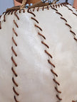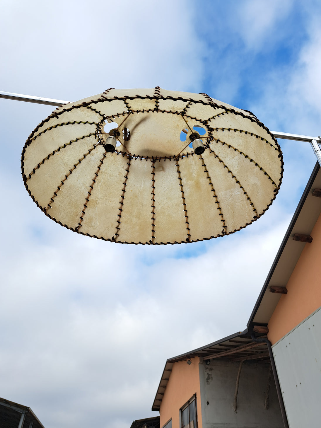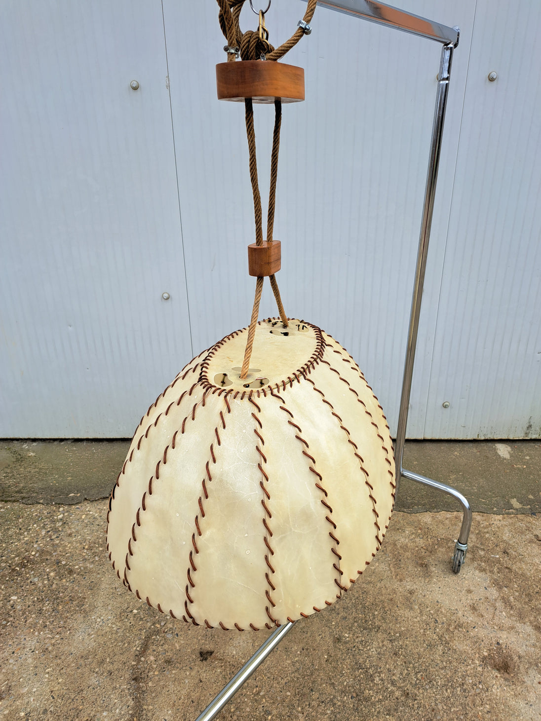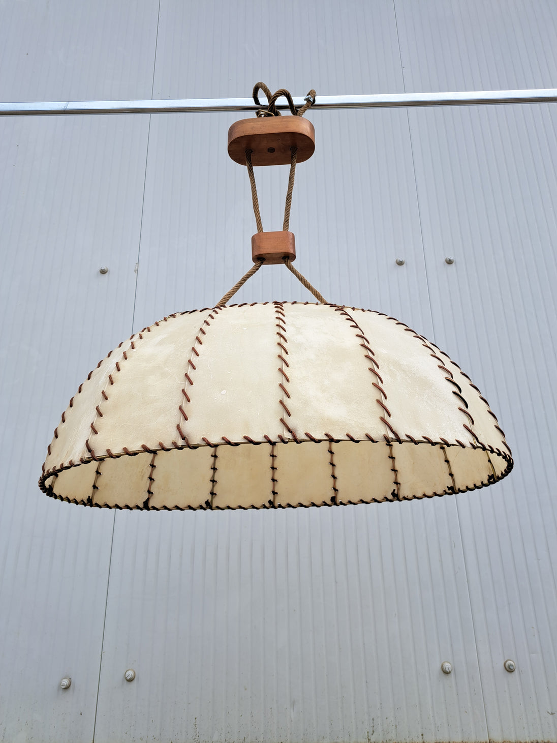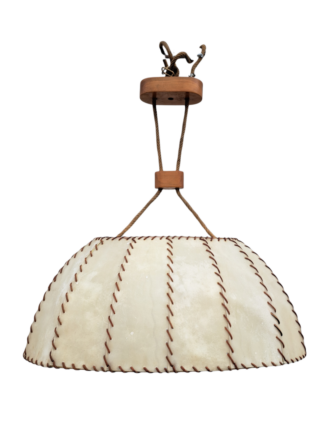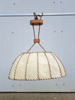 Lampada a sospensione di produzione italiana anni 60. Grande lampadario caratterizzato da paralume ovale a cupola rivestito da fasce di pergamena beige cucite tra loro da cordino di cuoio marrone, il tutto sorretto da due corde intrecciate che nascondono il collegamento elettrico e inserti in legno tra le corde. 2 punti luce attacco E27. Buone condizioni generali, si evidenzia una rottura della pergamena nei pressi di un portalampada (la struttura del lampadario rimane solida e non cede). Ideale per chi ricerca un lampadario vintage mid century dal gusto etnico e i colori caldi.