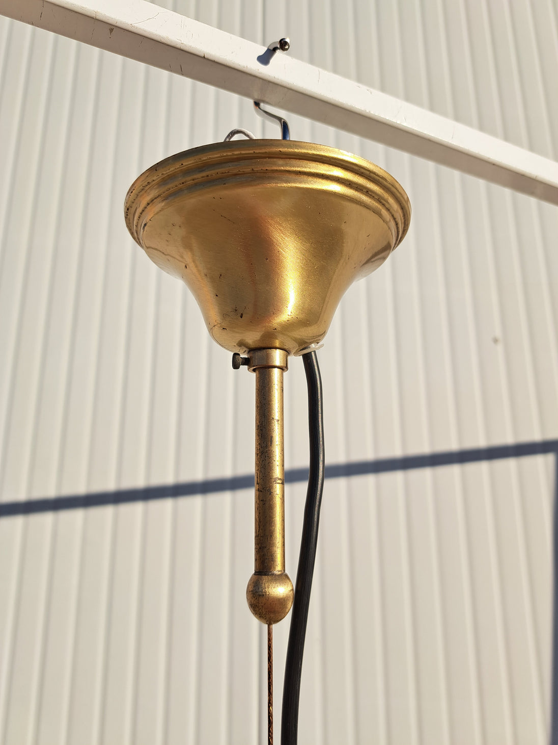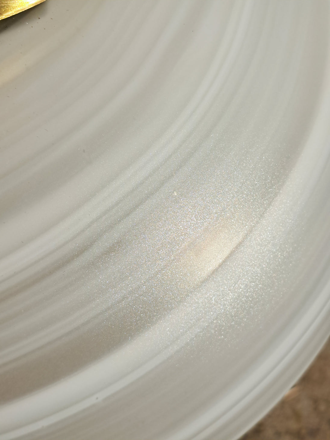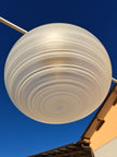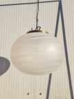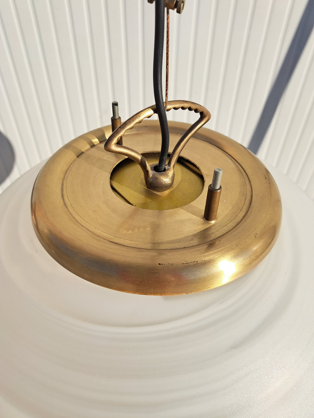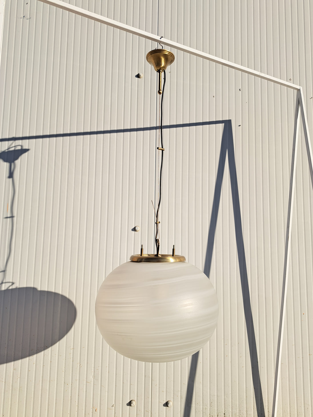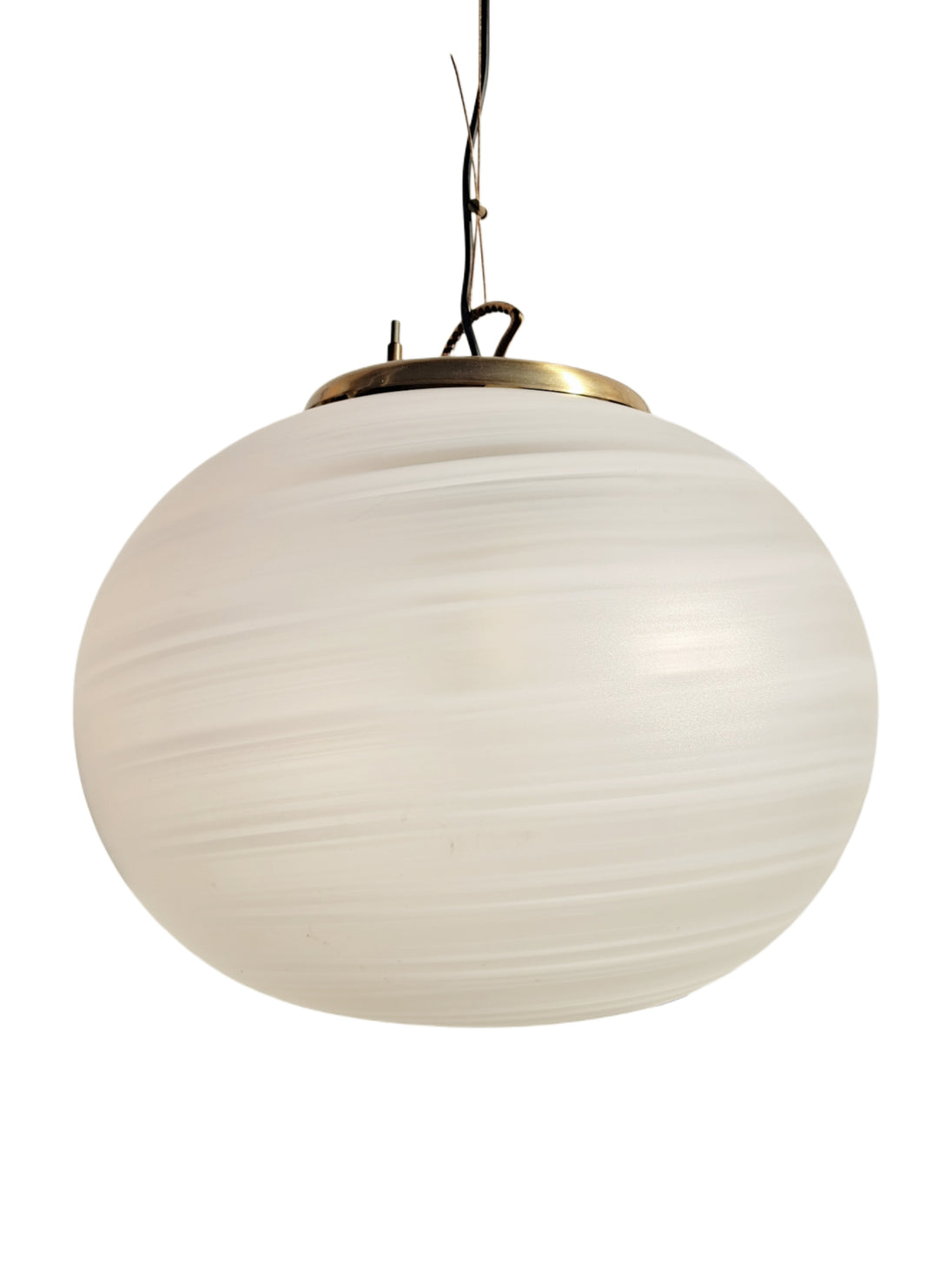 Lampadario a sospensione anni 70 con sfera ovalizzata in vetro satinato con striature bianche e attacco in metallo dorato. Attribuibile alla produzione del vetro artistico di Murano questo lampadario si presenta in buone condizioni si evidenzia un piccolo difetto sul vetro nella parte basse e leggeri segni del tempo sulle parti metalliche.