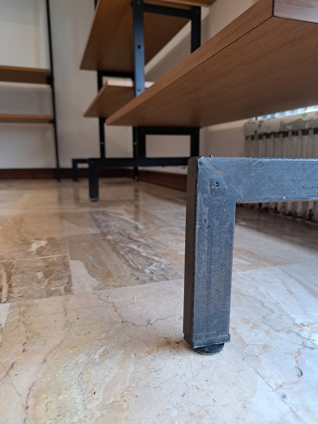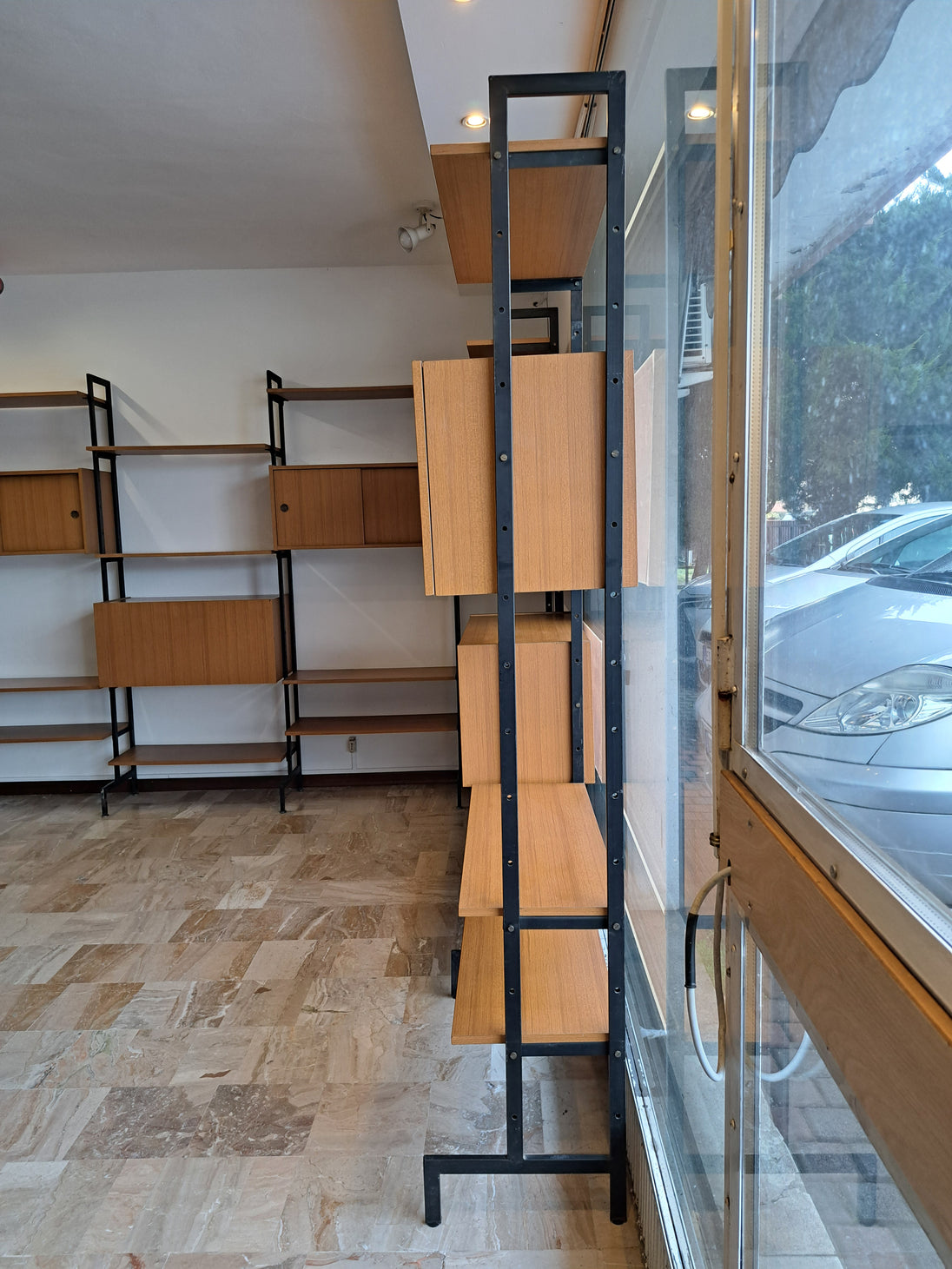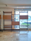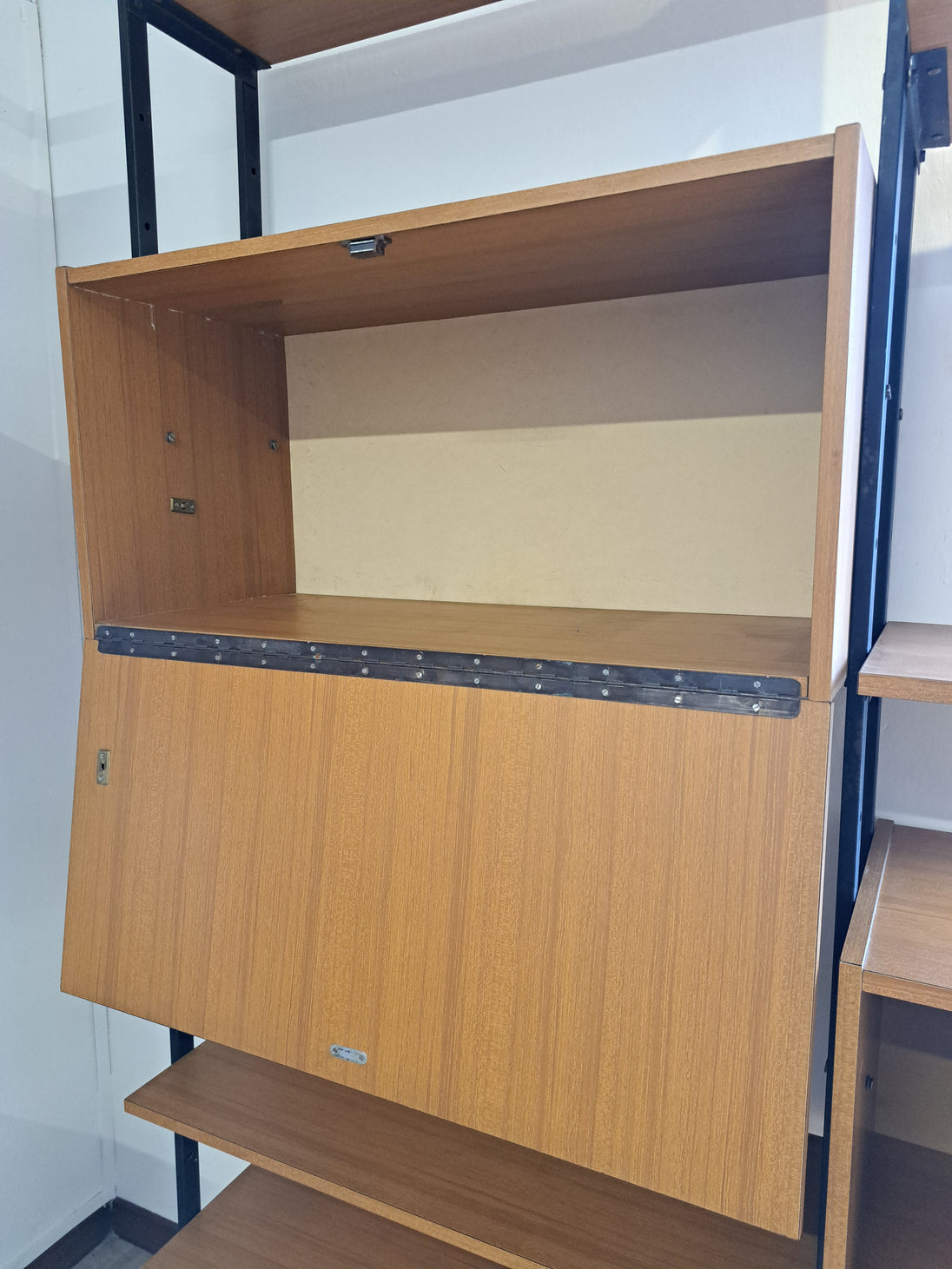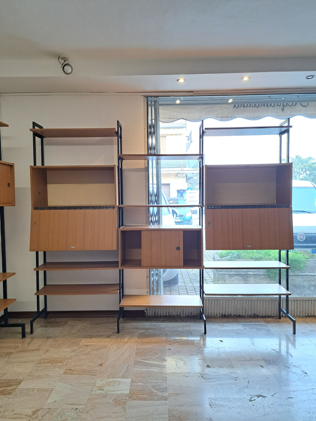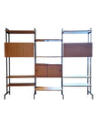 Libreria dallo stile nordico realizzata con 4 montanti di ferro che sorreggono 9 mensole, 1 stipo a doppio sportello scorrevole e 2 stipi con anta a ribalta. Produzione italiana anni 70 con moduli in legno impiallacciato di colore marrone chiaro. Di grande impatto estetico in ogni ambiente, sia moderno che vintage, la libreria si presenta in ottime condizioni generali con leggeri segni del tempo sulle componenti metalliche. Mensole e stipi sono posizionabili a piacere lungo le aste in ferro, è possibile quindi cambiare conformazione rispetto alle foto presentate. Sono disponibili 2 librerie a 3 moduli, il prezzo è inteso cadauna.