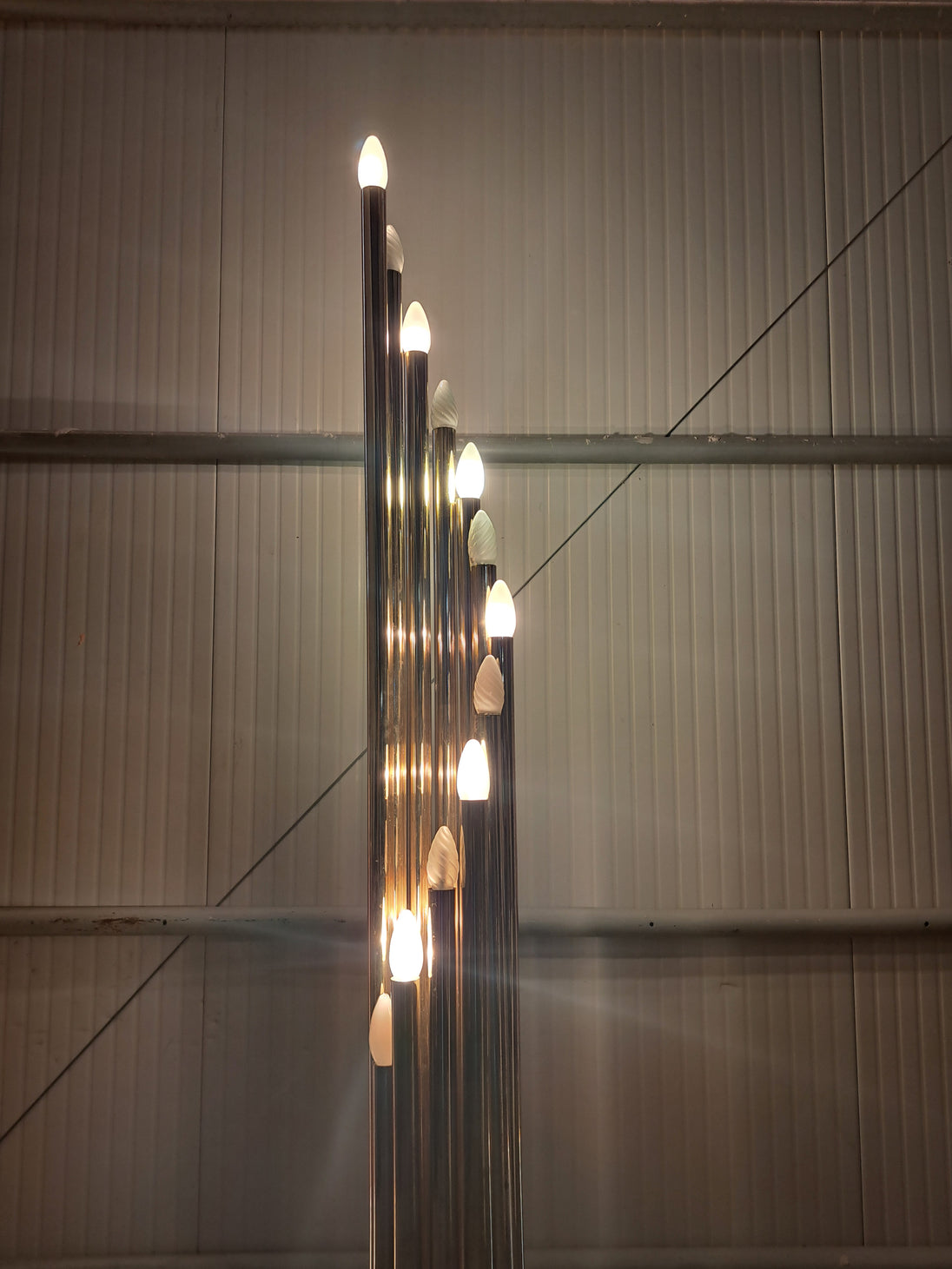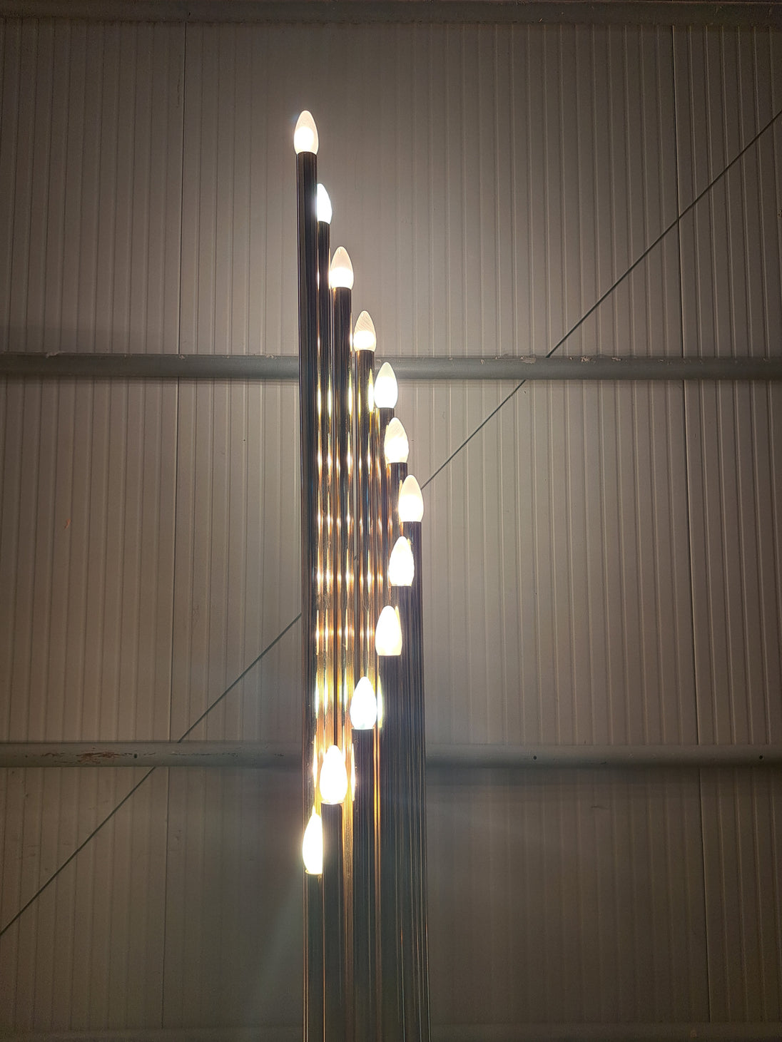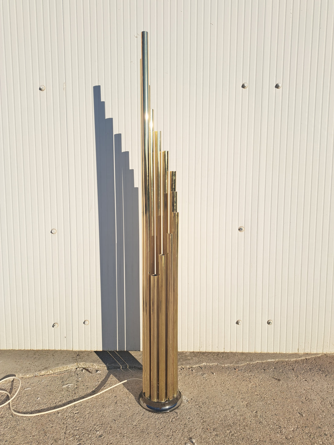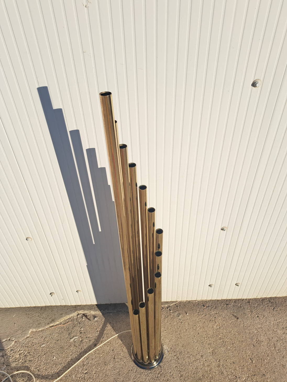 Lampada da terra a 12 canne dorate e 12 punti luci, produzione anni 70, modello Organ Pipe / Canne d'organo attribuita a Goffredo Reggiani. Lampada a piantana a base circolare dalla quale svettano 12 tubi verticali in metallo dorato sulla cui sommità soni posti i 12 portalampada con attacco E14, le luci sono disposte a diverse altezze con progredire a spirale. L'illuminazione ha 3 modalità d'accensione, simultanea con tutte le lampadine accese, e 2 modalità a luci alternate; questo consente di regolare l'intensità e al contempo aumenta la spettacolarità della lampada stessa, è possibile inoltre giocare con lampadine di forme o colori diversi in base al proprio gusto. Una lampada scultura che affascina sia da accesa che da spenta. Buone condizioni generali con segni del tempo e tracce di ossidazione sul metallo.