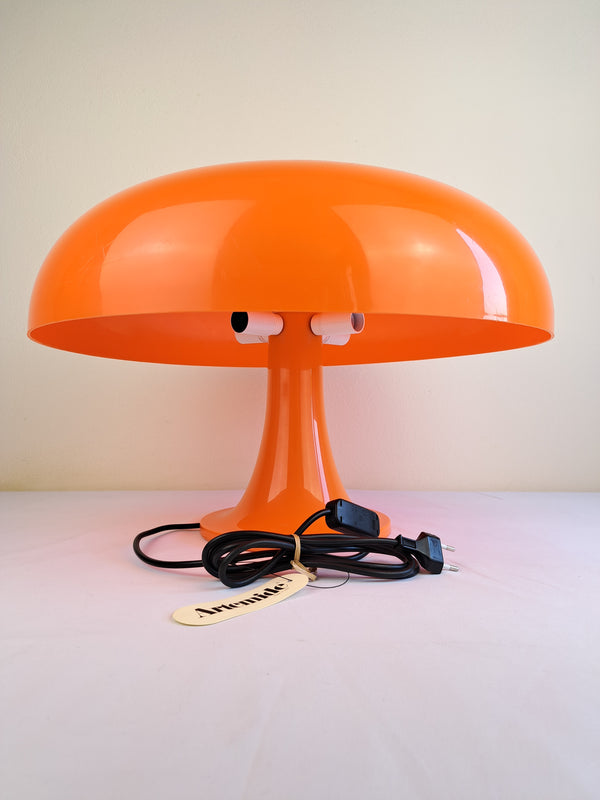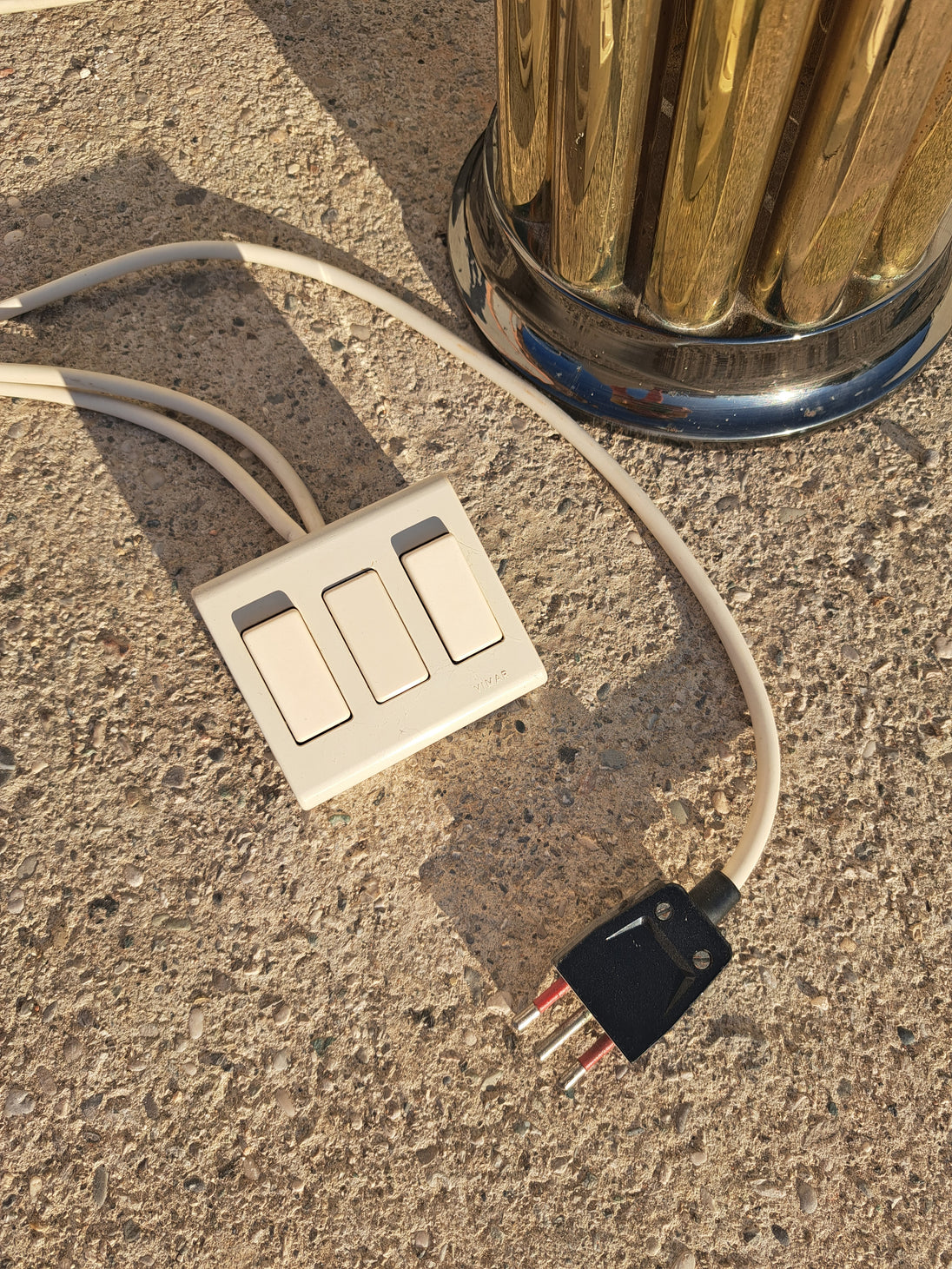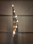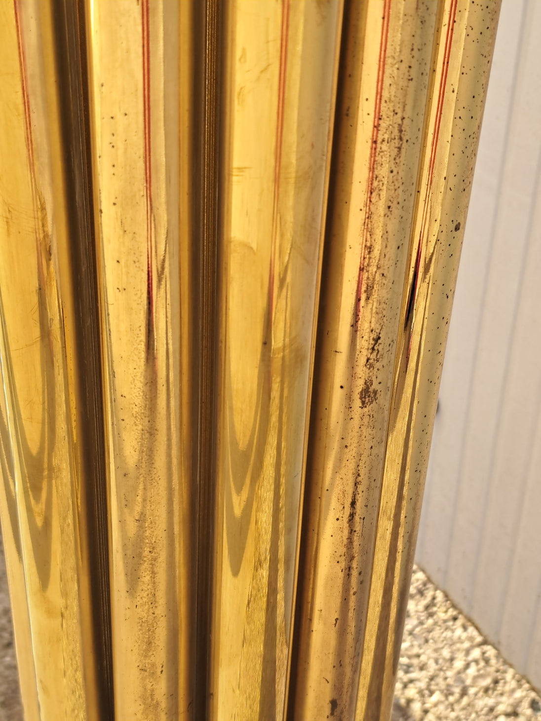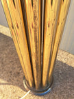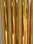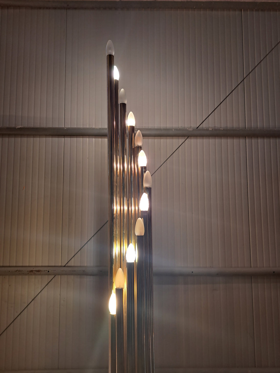 Lampada da terra a 12 canne dorate e 12 punti luci, produzione anni 70, modello Organ Pipe / Canne d'organo attribuita a Goffredo Reggiani. Lampada a piantana a base circolare dalla quale svettano 12 tubi verticali in metallo dorato sulla cui sommità soni posti i 12 portalampada con attacco E14, le luci sono disposte a diverse altezze con progredire a spirale. L'illuminazione ha 3 modalità d'accensione, simultanea con tutte le lampadine accese, e 2 modalità a luci alternate; questo consente di regolare l'intensità e al contempo aumenta la spettacolarità della lampada stessa, è possibile inoltre giocare con lampadine di forme o colori diversi in base al proprio gusto. Una lampada scultura che affascina sia da accesa che da spenta. Buone condizioni generali con segni del tempo e tracce di ossidazione sul metallo.