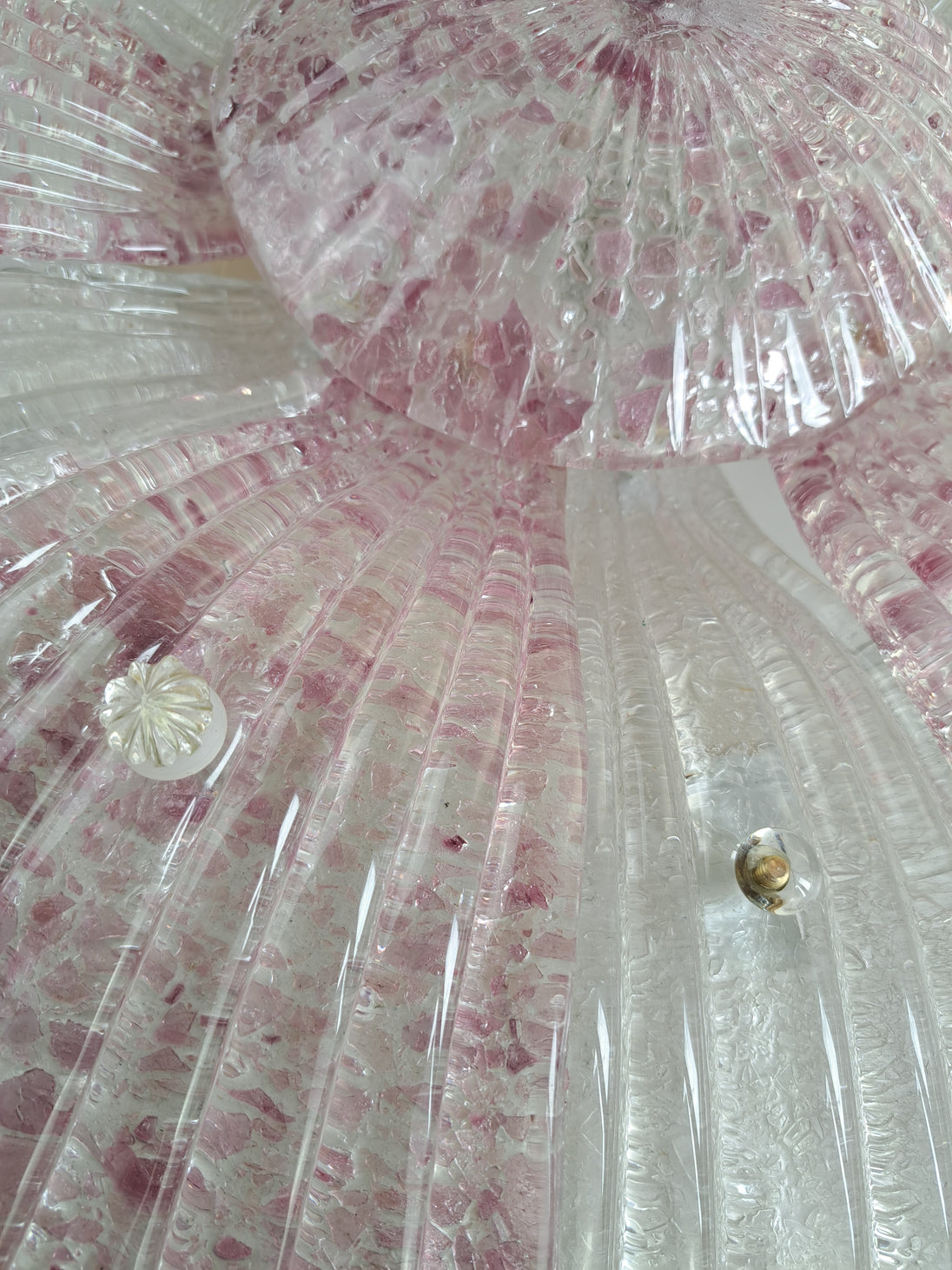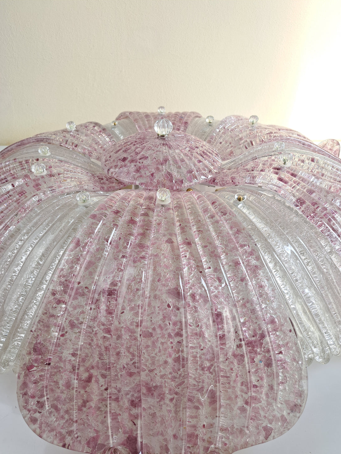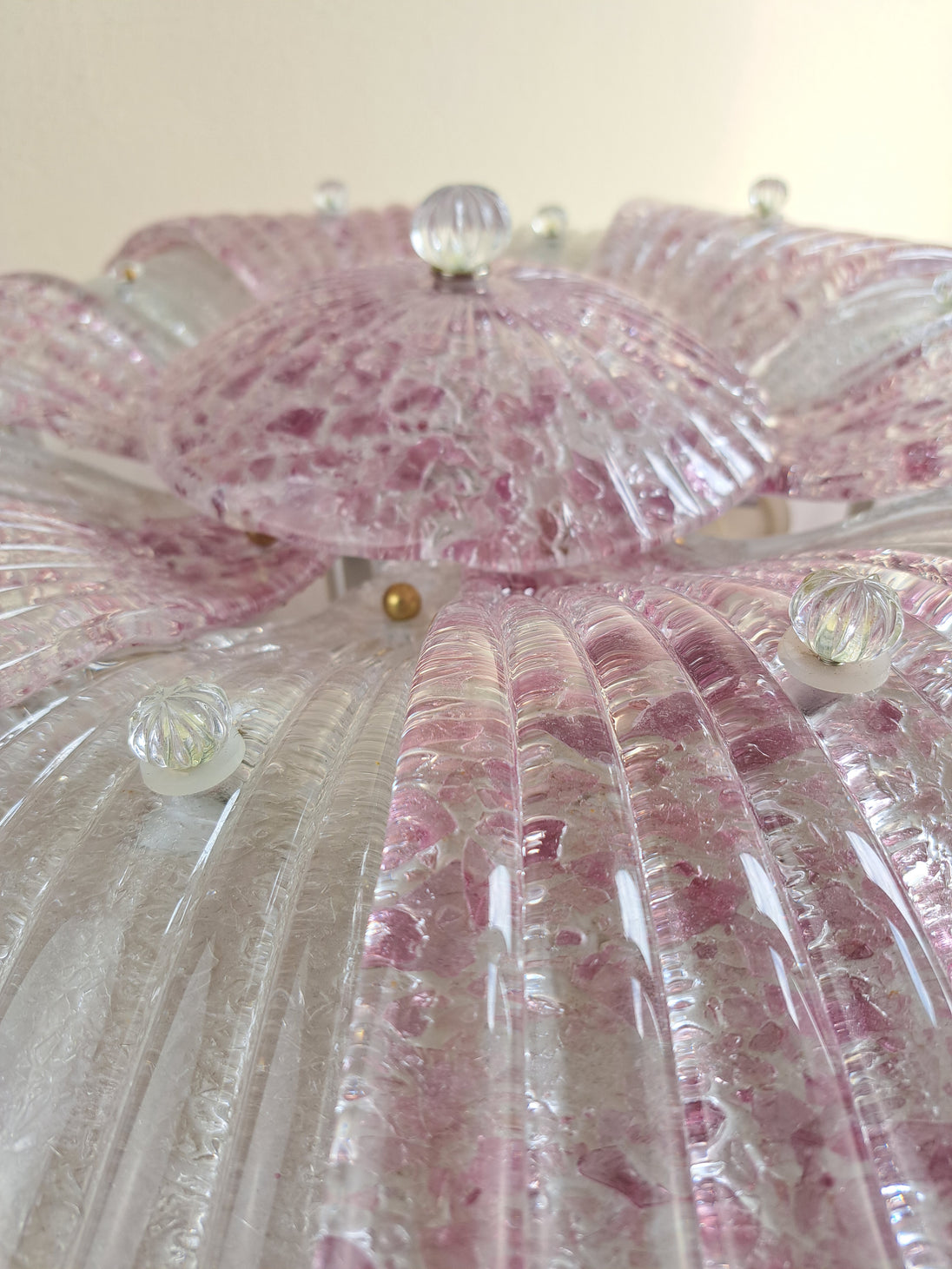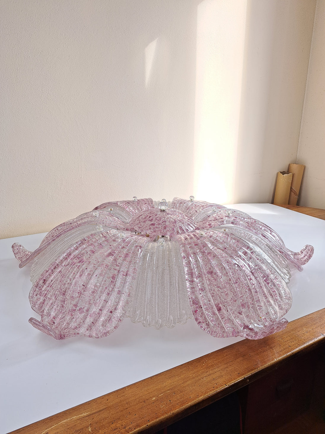 Grande plafoniera in stile classico, made in Italy anni '80 / '90 prodotta da Sylcom, azienda veneziana specializzata nella lavorazione del vetro e in lampadari di lusso. Questa lampada da soffitto a forma di fiore è formata da 12 grandi petali in vetro graniglia alternati nei colori rosa e trasparente che celano 6 punti luce con attacco E27. Adatta ad ambienti medio-grandi come camere o salotti, dona carattere ed eleganza alla stanza. Ottime condizioni generali, si evidenzia la presenza di 2 chiodini di fissaggio con testa in vetro liscia piuttosto che a bocciolo. 2 Plafoniere uguali disponibili, prezzo inteso cadauna.