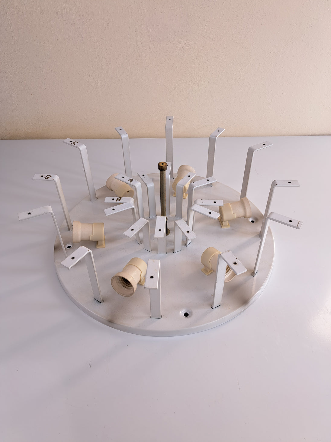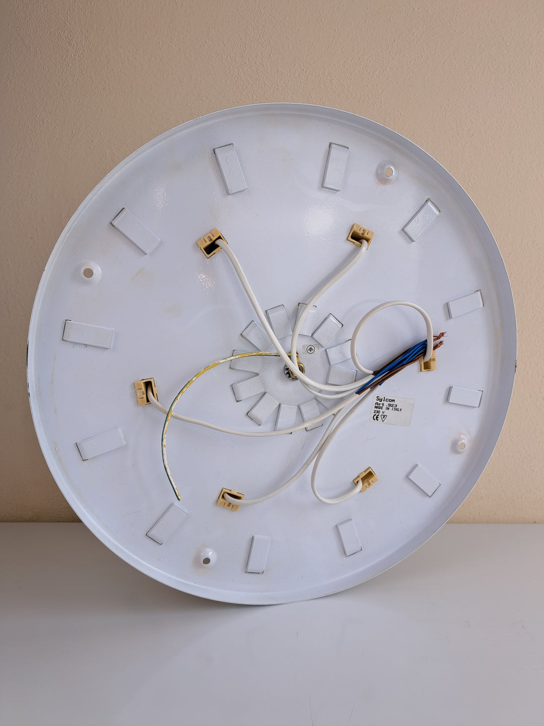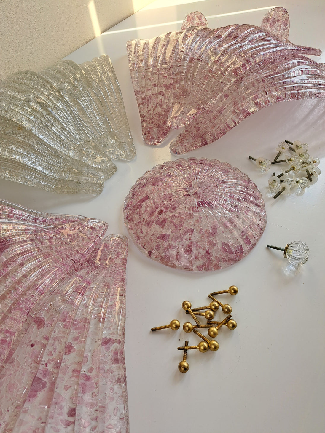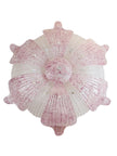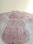 Grande plafoniera in stile classico, made in Italy anni '80 / '90 prodotta da Sylcom, azienda veneziana specializzata nella lavorazione del vetro e in lampadari di lusso. Questa lampada da soffitto a forma di fiore è formata da 12 grandi petali in vetro graniglia alternati nei colori rosa e trasparente che celano 6 punti luce con attacco E27. Adatta ad ambienti medio-grandi come camere o salotti, dona carattere ed eleganza alla stanza. Ottime condizioni generali, si evidenzia la presenza di 2 chiodini di fissaggio con testa in vetro liscia piuttosto che a bocciolo. 2 Plafoniere uguali disponibili, prezzo inteso cadauna.