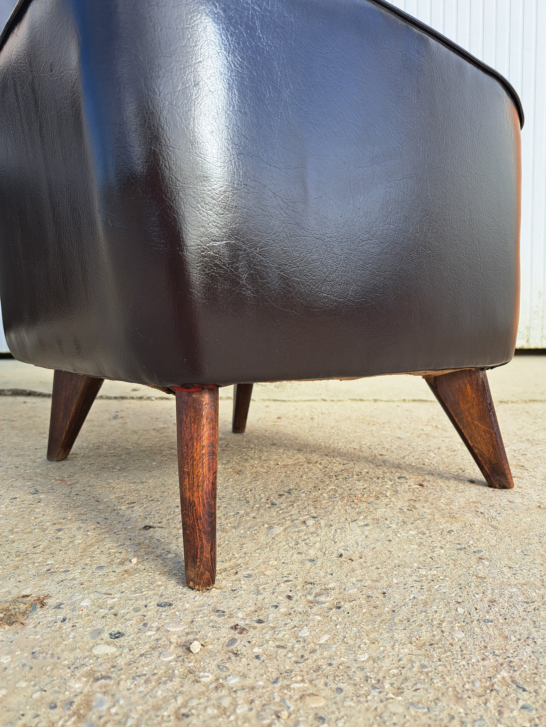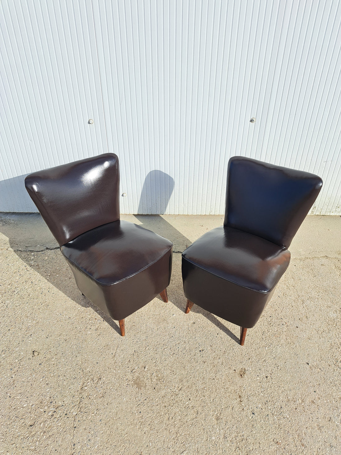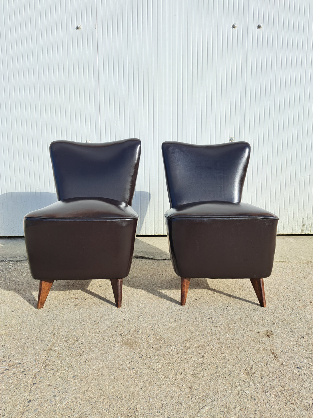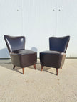 Coppia di poltroncine attribuibili alla linea Perla, disegnate da Giulia Veronesi per ISA Bergamo negli anni 50. Sedie da camera imbottite e rivestite in pelle marrone scuro con inserti di borchie lungo le cuciture, alla base zampe coniche in legno. Caratterizzate da linee morbide e gambe sottili che ne alleggeriscono e slanciano la forma, portano con sé il fascino del design italiano di metà secolo. Ottime condizioni generali con alcuni segni del tempo.