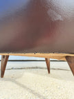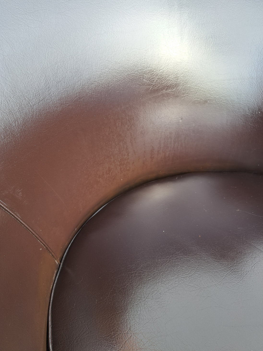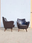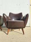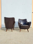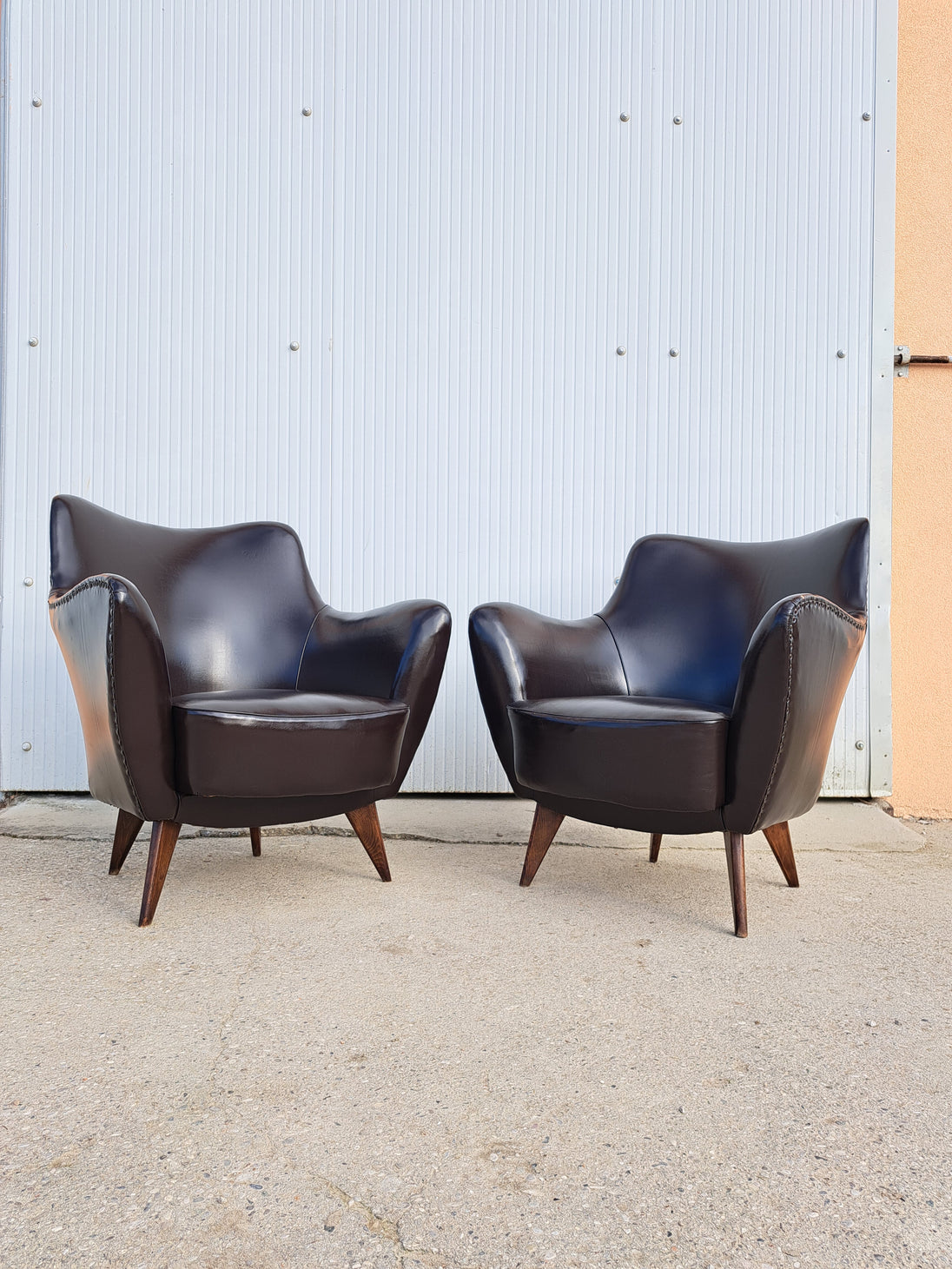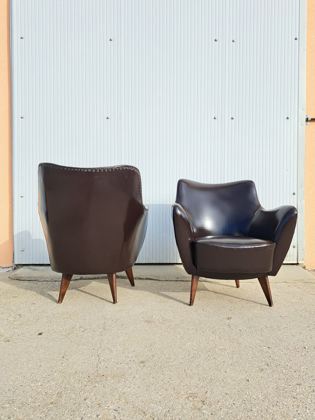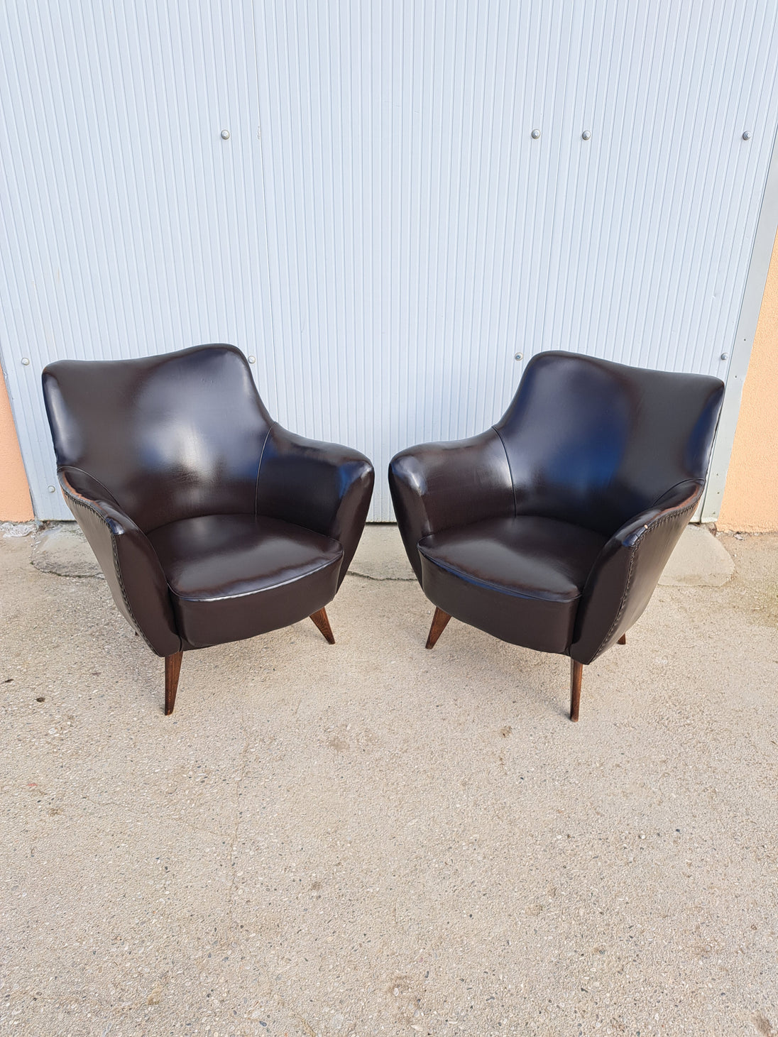 Coppia di poltrone attribuibili a modello Perla, disegnate da Giulia Veronesi per ISA Bergamo negli anni 50. Poltrone con braccioli rivestite in pelle marrone scuro con inserti di borchie lungo le cuciture, alla base zampe coniche in legno. La seduta si distingue per le sue forme morbide e avvolgenti: lo schienale e i braccioli creano un unico volume curvo che rende la poltrona accogliente e confortevole. Mentre le gambe sottili e leggermente inclinate alleggeriscono visivamente la struttura, dando alla poltrona un aspetto raffinato e slanciato. Grazie al suo equilibrio tra comfort e stile, la poltrona Perla si inserisce facilmente sia in interni moderni sia in ambienti più classici, portando con sé il fascino del design italiano di metà secolo. Buone condizioni generali con alcuni segni del tempo, si evidenziano alcune macchie sulla pelle e una piccola lacerazione su un bracciolo.