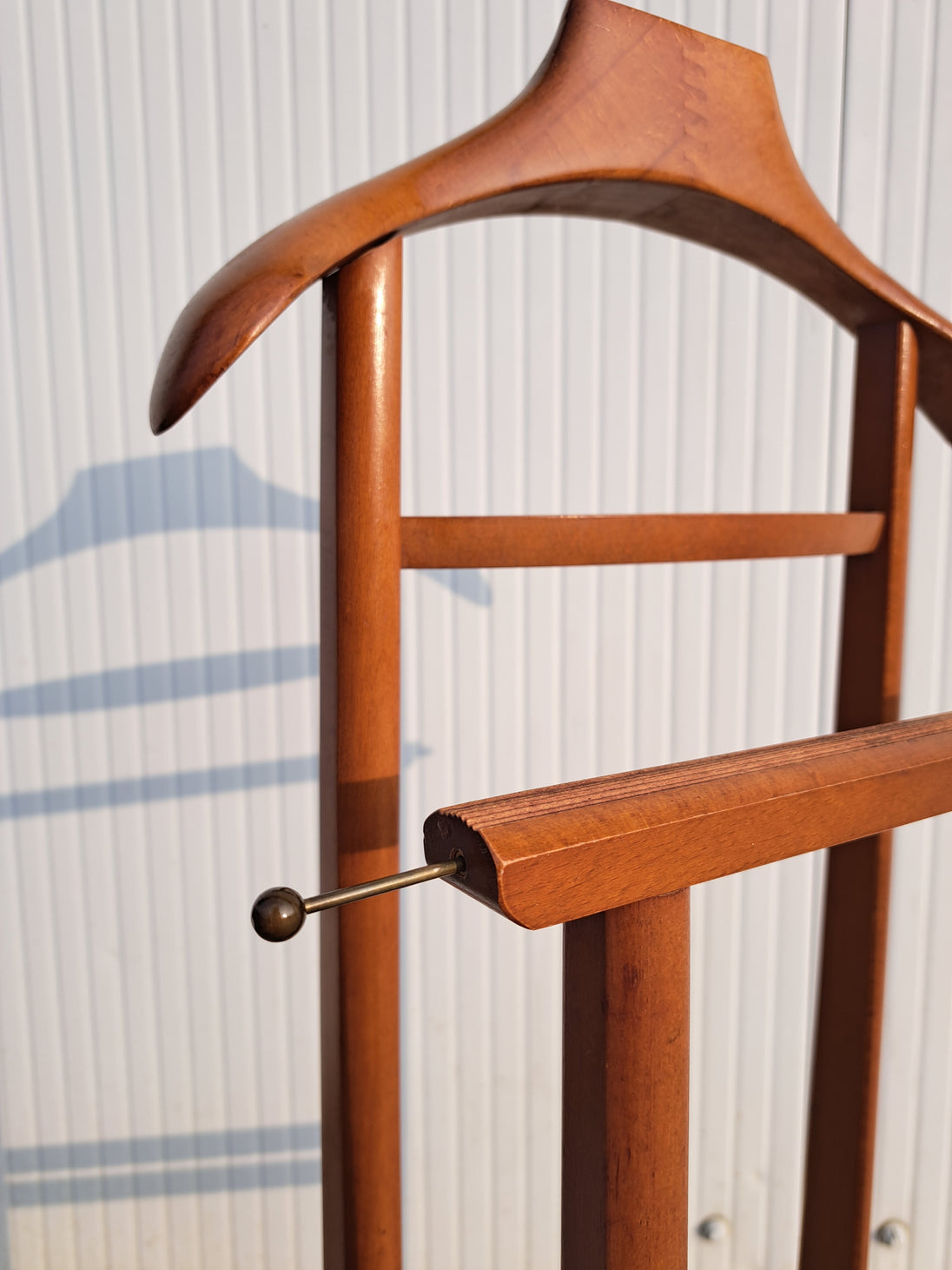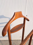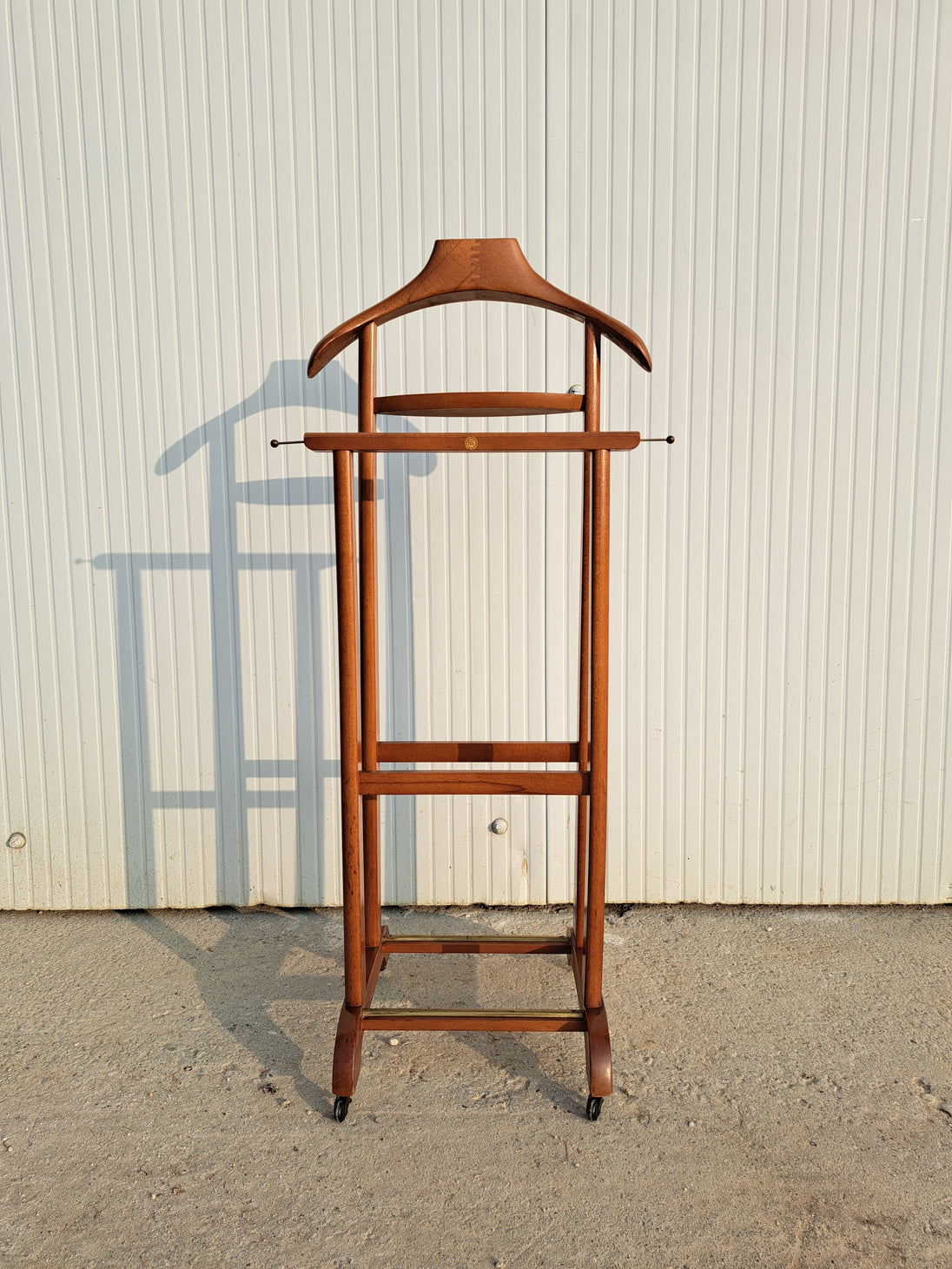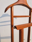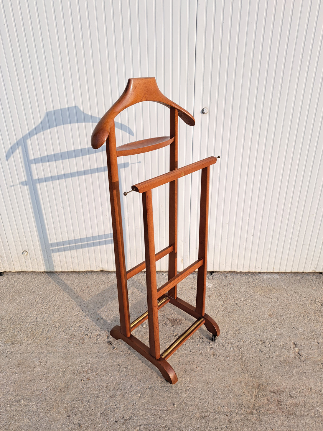 Appendiabiti servomuto in legno e ottone prodotto dai Fratelli Reguitti negli anni 50 / 60. Il porta abiti è composto da una base poggiascarpe con rotelle e una doppia struttura verticale con stampella porta giacca e camicia, inserti porta cravatte estraibili, assi trasversali porta pantaloni e piccolo scomparto a ciotola porta orologio o accessori. Un elemento d'arredo per la camera, funzionale, compatto ed elegante che richiama un modo di vestire tipico di quegli anni. Nella parte superiore è impresso il marchio dorato Fratelli Reguitti made in Italy. Ottime condizioni generali con piccoli segni di utilizzo e del tempo.