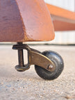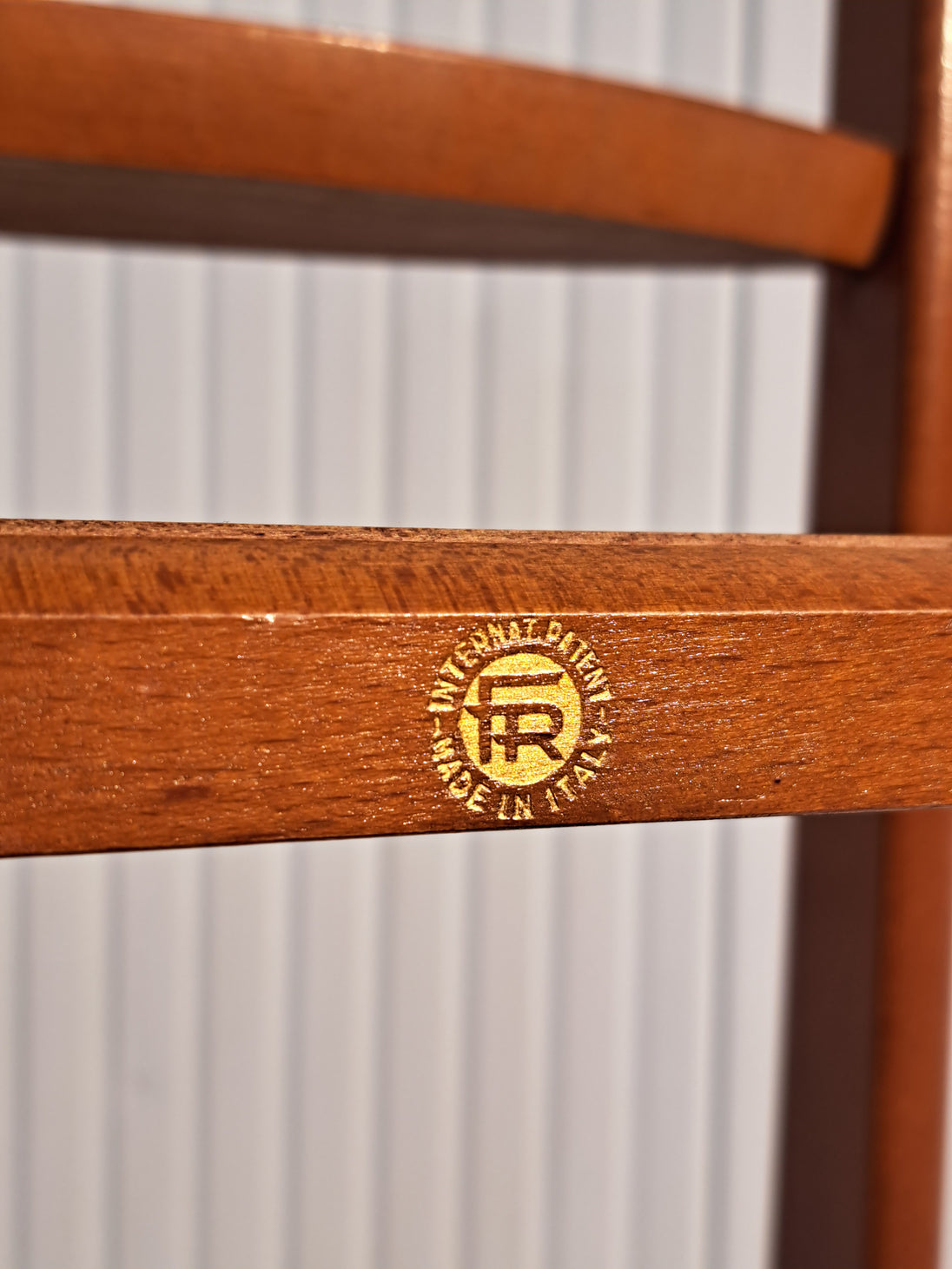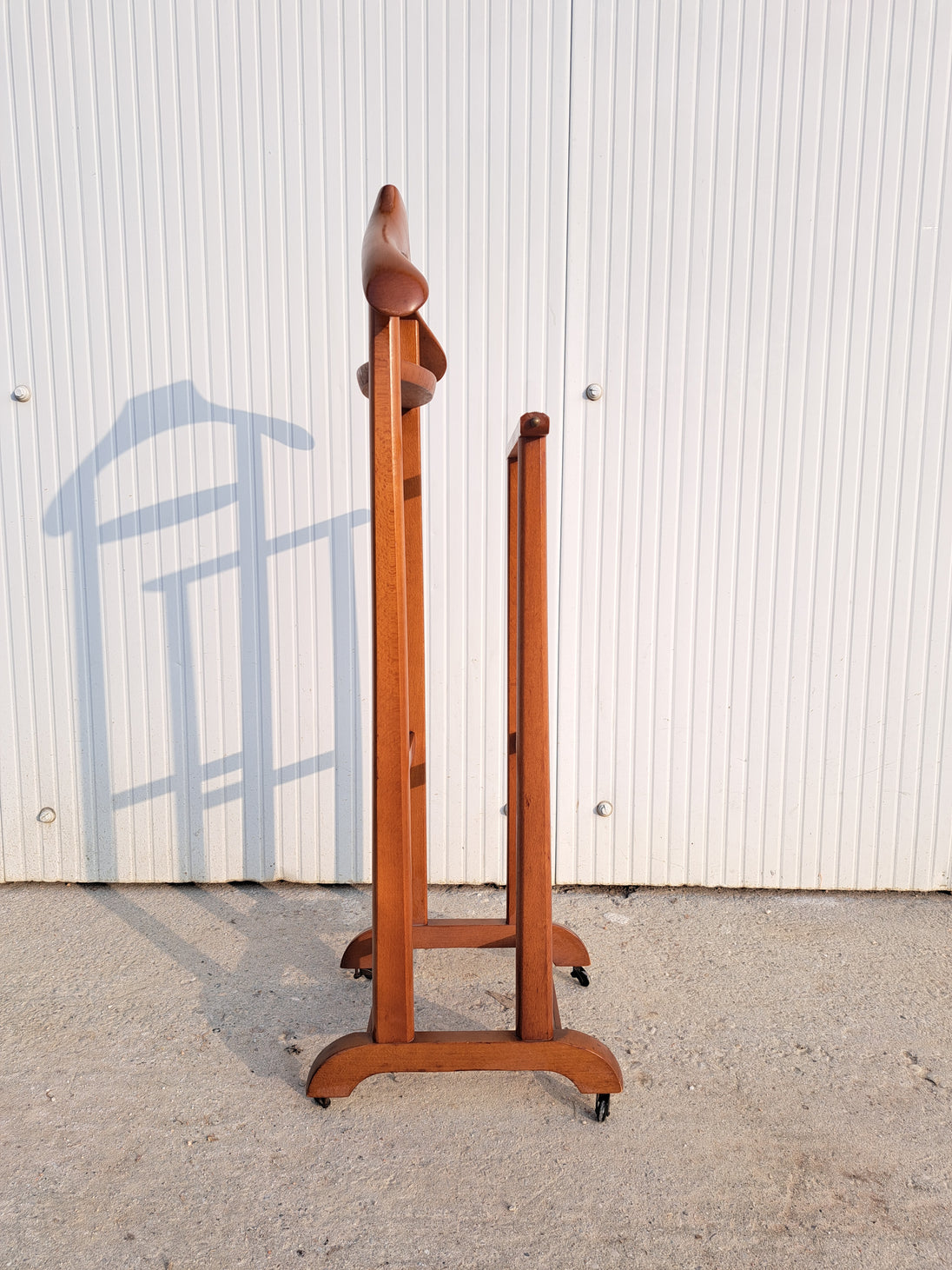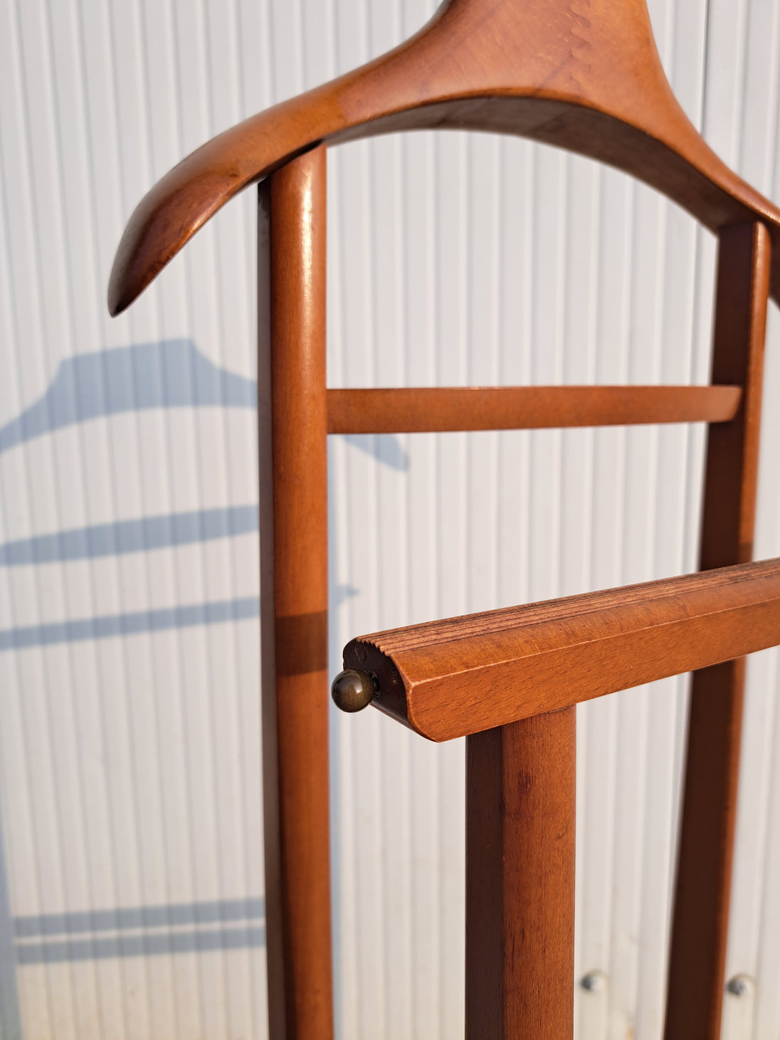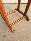 Appendiabiti servomuto in legno e ottone prodotto dai Fratelli Reguitti negli anni 50 / 60. Il porta abiti è composto da una base poggiascarpe con rotelle e una doppia struttura verticale con stampella porta giacca e camicia, inserti porta cravatte estraibili, assi trasversali porta pantaloni e piccolo scomparto a ciotola porta orologio o accessori. Un elemento d'arredo per la camera, funzionale, compatto ed elegante che richiama un modo di vestire tipico di quegli anni. Nella parte superiore è impresso il marchio dorato Fratelli Reguitti made in Italy. Ottime condizioni generali con piccoli segni di utilizzo e del tempo.