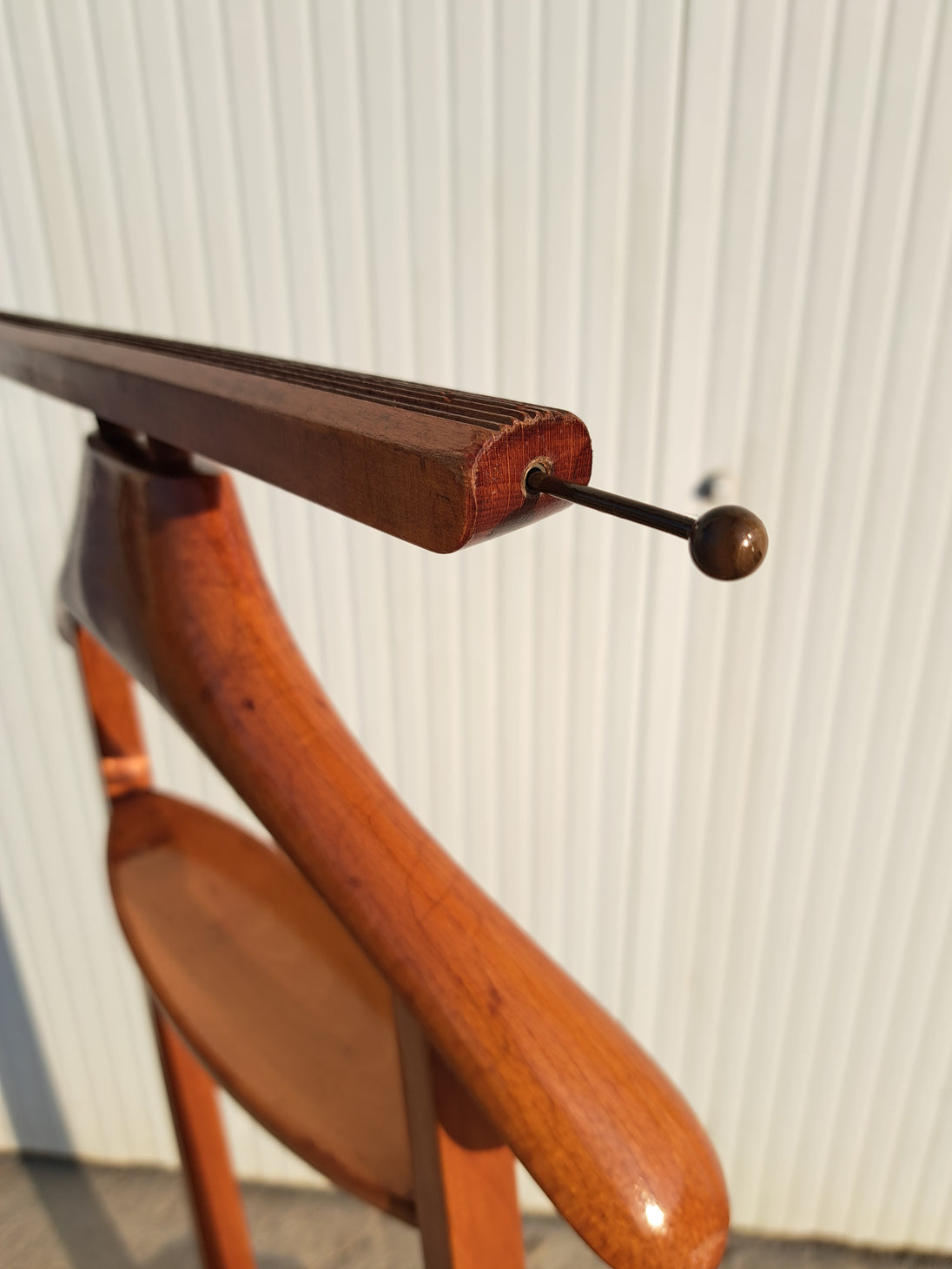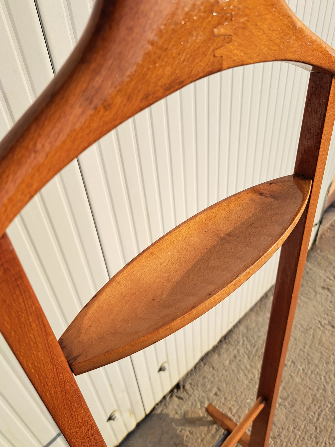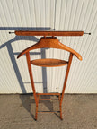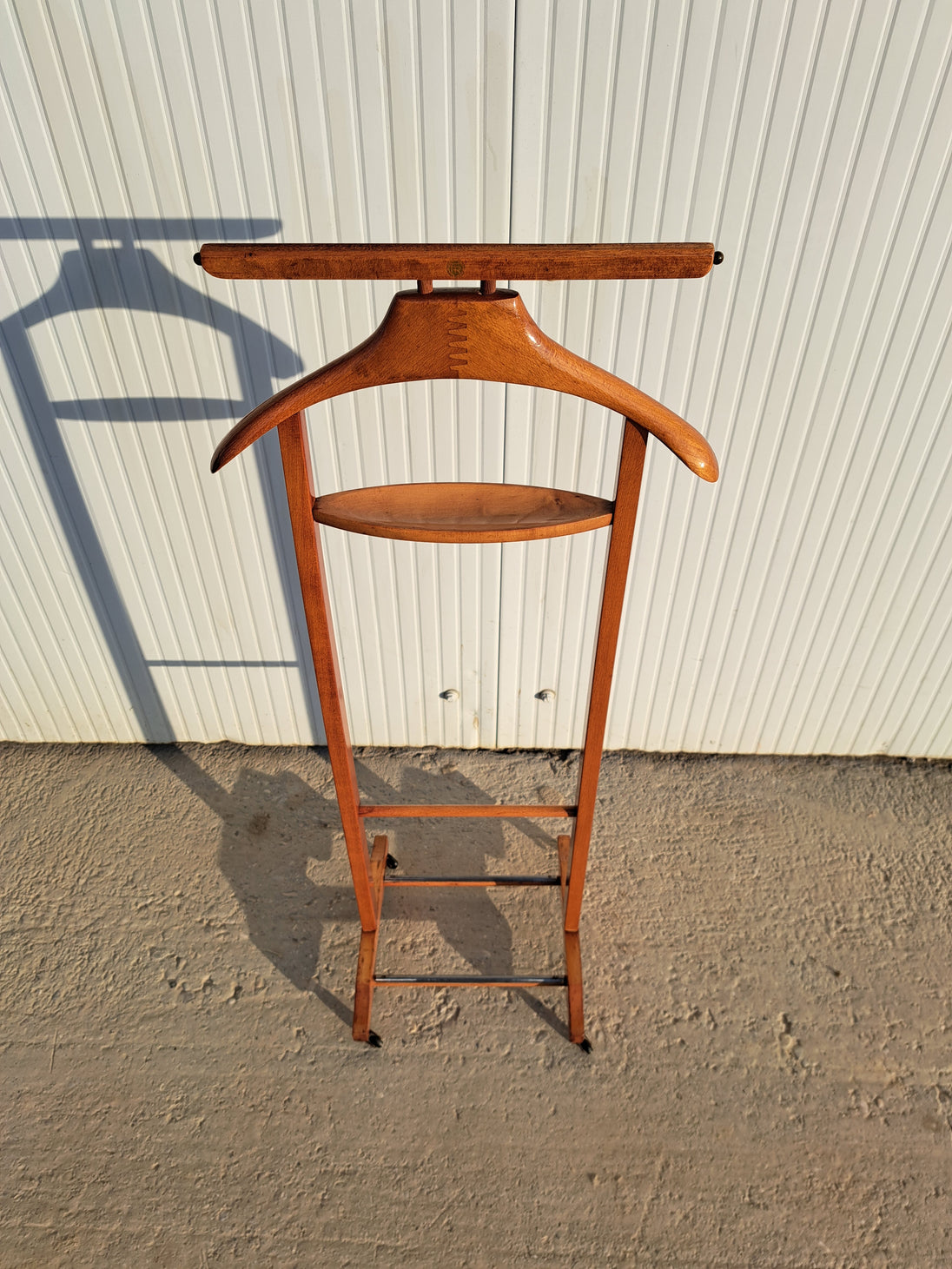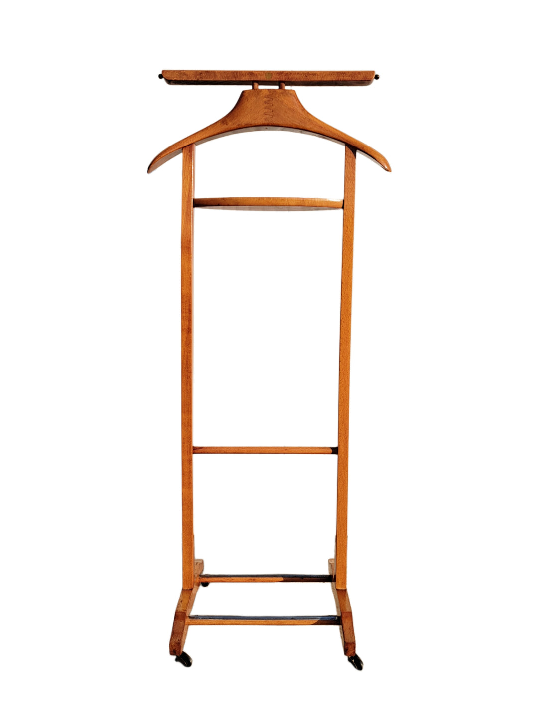 Appendiabiti servomuto in legno e ottone prodotto dai Fratelli Reguitti negli anni 50 / 60. Il porta abiti è composto da una base poggiascarpe con rotelle e una struttura verticale con stampella porta giacca e camicia, inserti porta cravatte estraibili, assi trasversali porta pantaloni e piccolo scomparto a ciotola porta orologio o accessori. Un elemento d'arredo per la camera, funzionale, compatto ed elegante che richiama un modo di vestire tipico di quegli anni. Nella parte superiore è impresso il marchio dorato Fratelli Reguitti made in Italy. Discrete condizioni generali con alcuni segni del tempo e di usura, si evidenziano delle scheggiature nelle parti terminali esterne della stampella porta giacca.