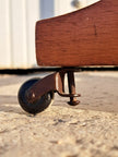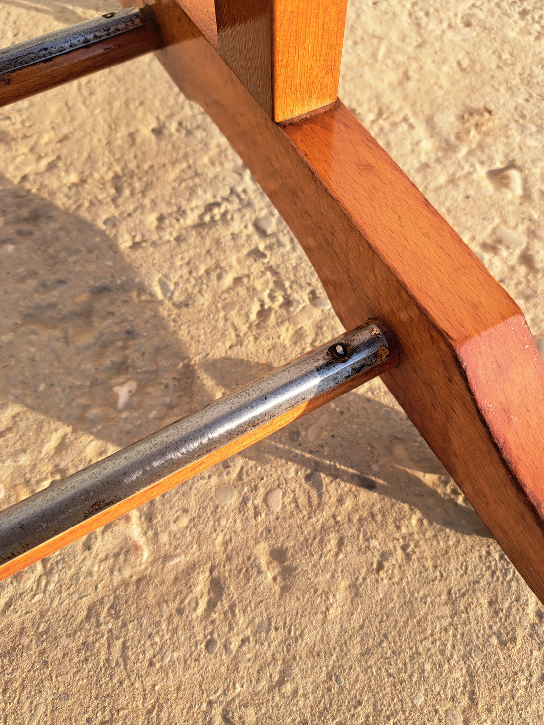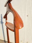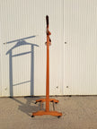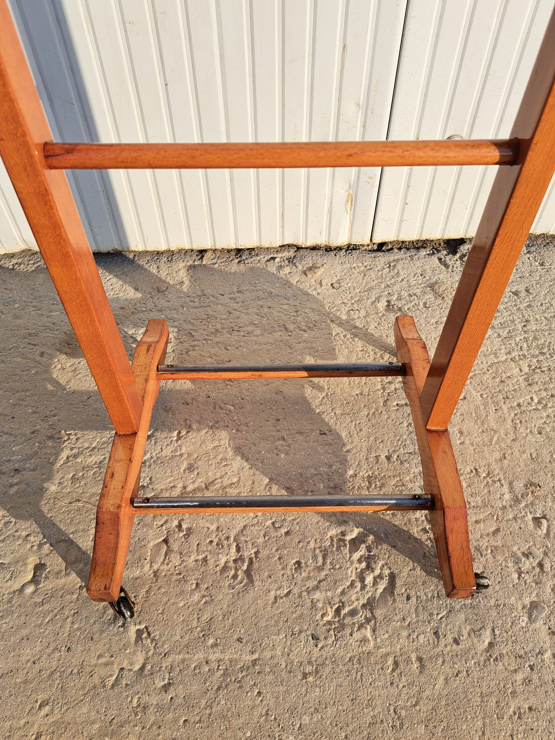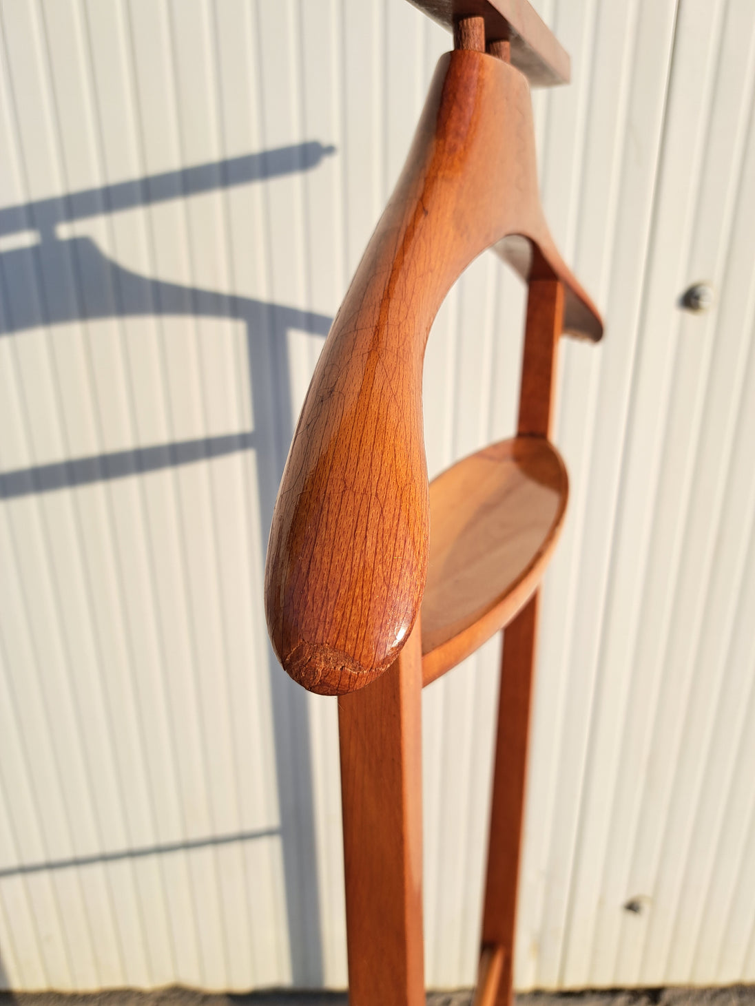 Appendiabiti servomuto in legno e ottone prodotto dai Fratelli Reguitti negli anni 50 / 60. Il porta abiti è composto da una base poggiascarpe con rotelle e una struttura verticale con stampella porta giacca e camicia, inserti porta cravatte estraibili, assi trasversali porta pantaloni e piccolo scomparto a ciotola porta orologio o accessori. Un elemento d'arredo per la camera, funzionale, compatto ed elegante che richiama un modo di vestire tipico di quegli anni. Nella parte superiore è impresso il marchio dorato Fratelli Reguitti made in Italy. Discrete condizioni generali con alcuni segni del tempo e di usura, si evidenziano delle scheggiature nelle parti terminali esterne della stampella porta giacca.