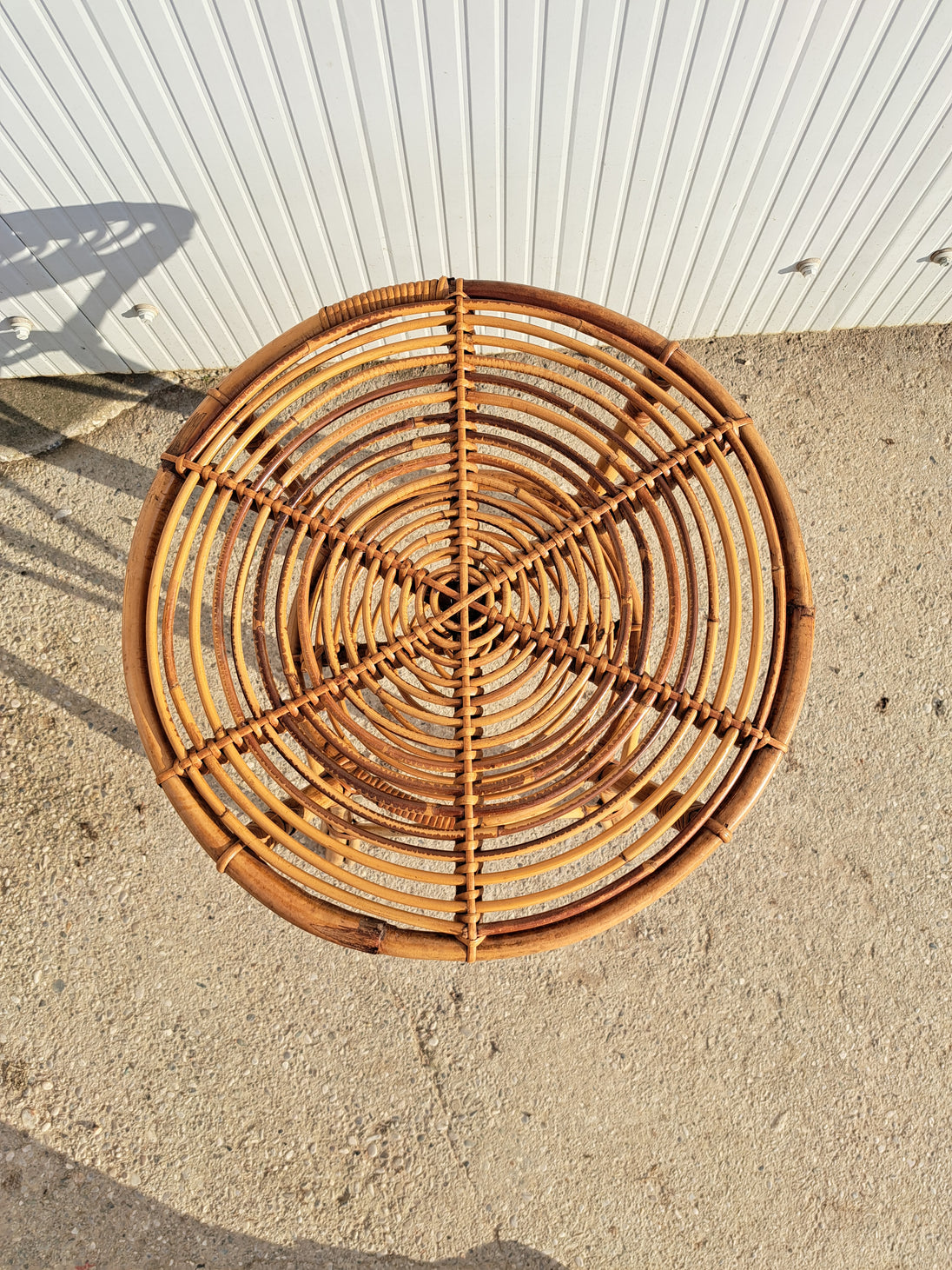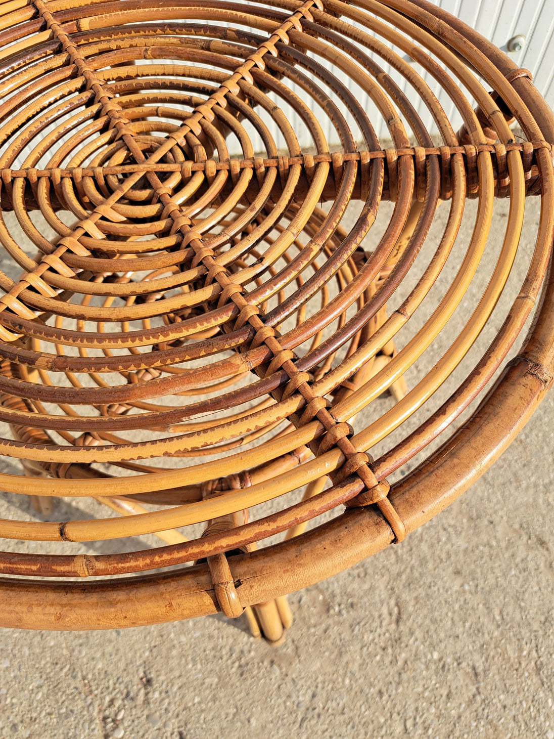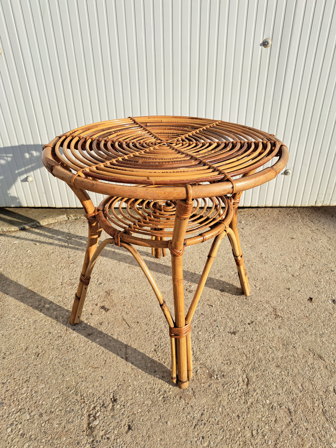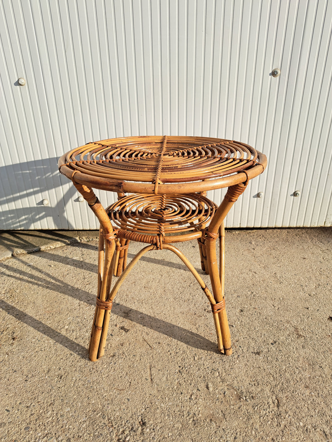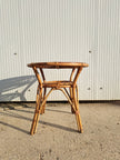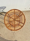 Piccolo tavolo di servizio in bambù e vimini intrecciato, produzione italiana anni 60. Forma rotonda con doppio piano di appoggio e 4 zampe. Adatto per l'interno o esterno coperto come una veranda o portico, compatto e leggero da spostare. Ottime condizioni generali, sempre tenuto dentro casa quindi non risulta scolorito dal sole.